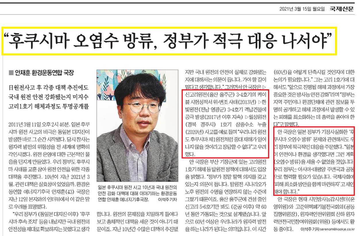 <“후쿠시마 오염수 방류, 정부가 적극 대응 나서야”>(3/15, 20면, 이석주 기자)http://www.kookje.co.kr/news2011/asp/newsbody.asp?code=2100&key=20210315.22020004276
