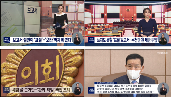 이렇게 정책에 반영할 수 없는 연구보고서 22건에 총 투입된 세금은 5억 원으로, 사실상 부산시의회의 정책연구용역제도가 세금 낭비 사업임을 꼬집었습니다. 이 제도가 부실하게 운영된 가장 큰 이유는 관련 조례나 매뉴얼이 하나도 없다는 것인데, 부산MBC의 보도 이후 시의회가 부실을 인정하고 관리 책임을 강화하고 대대적인 수정, 보완조치 및 조례·매뉴얼을 제·개정하겠다는 입장을 밝히기도 했습니다.