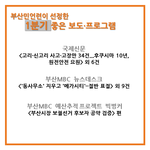 부산민주언론시민연합(이하 부산민언련)은 지역의 좋은 보도·프로그램을 발굴하고 그 가치를 알리기 위해 분기별 좋은 보도·프로그램을 선정ˑ발표하고 있습니다.