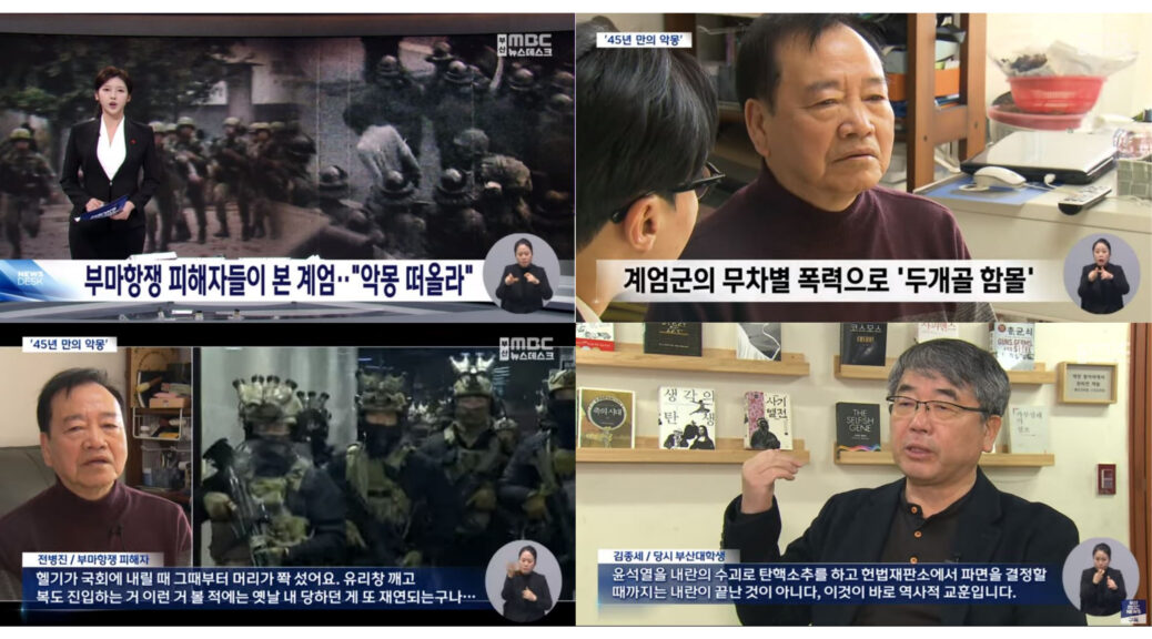부산MBC는 부마항쟁 당시 국가폭력 피해자에게 이번 비상계엄 사태를 어떻게 바라보고 있는지 물었다. 피해자들은 부산MBC에 그때의 공포가 되살아났다고 말했다. 이어 이 “비극적인 역사를 반복하지 않기 위해선 이 사태를 일으킨 장본인을 그 자리에서 끌어내리는 것뿐”이라고 입을 모았다.