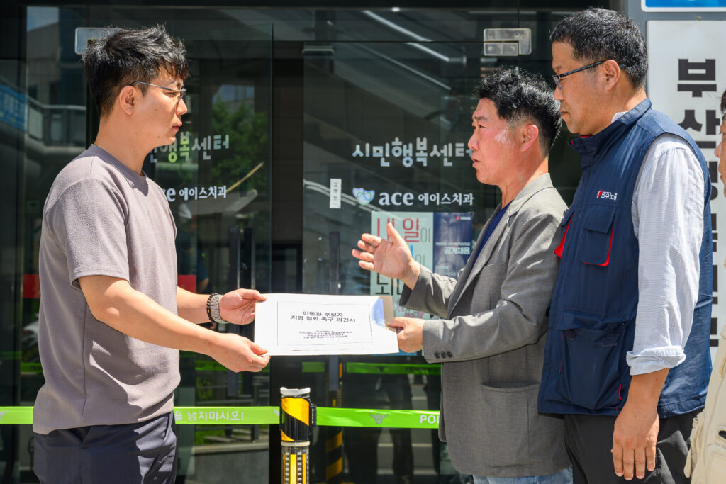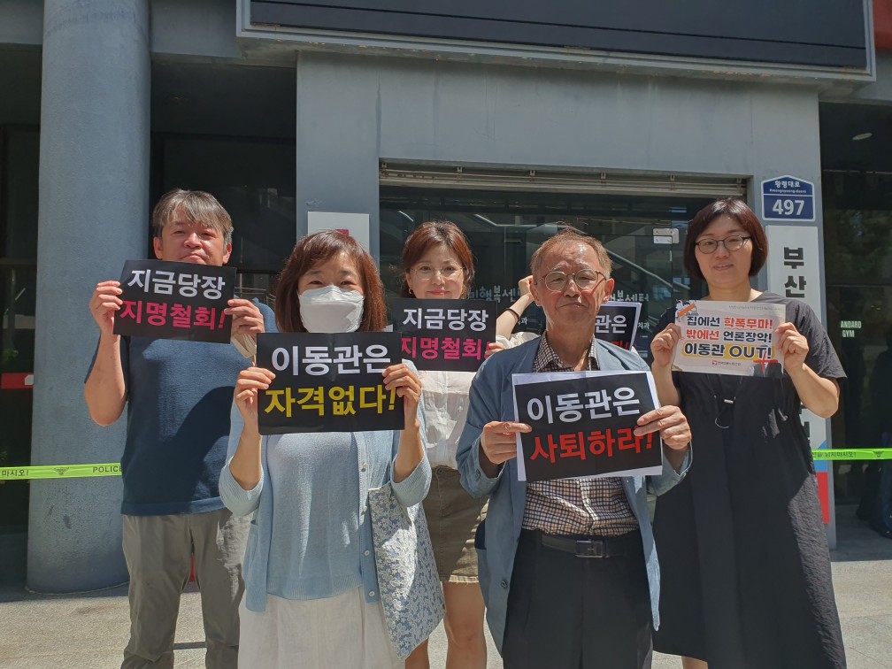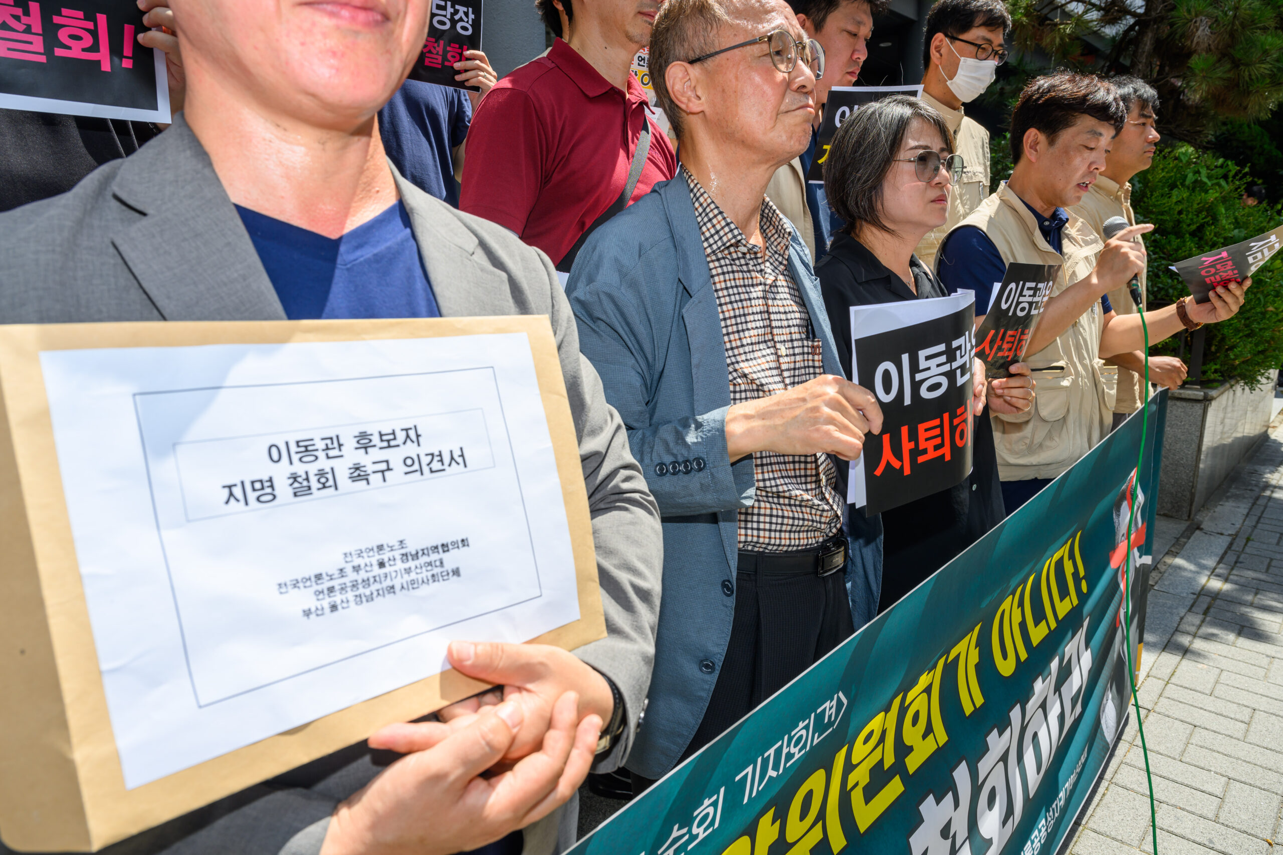 참가자들의 주요 발언과 기자회견문 낭독 후, 국민의힘 부산시당 관계자에게 이동관 후보 지명 철회를 촉구하는 의견서를 전달하는 것으로 기자회견을 마무리했습니다.