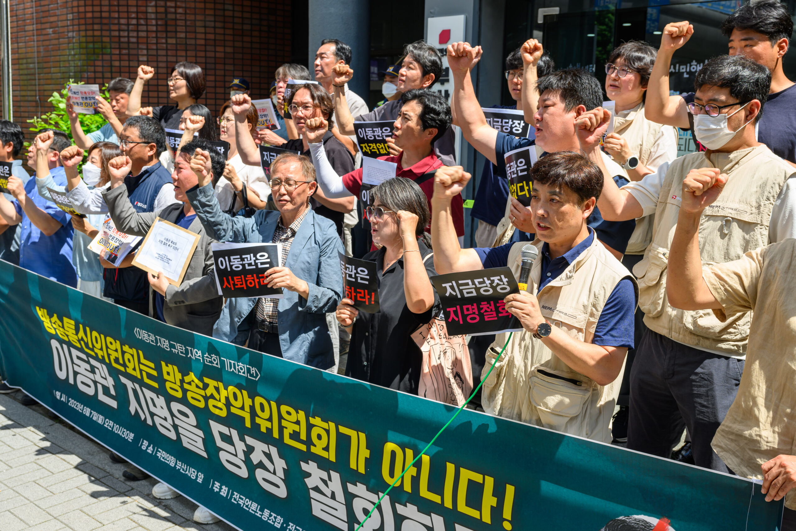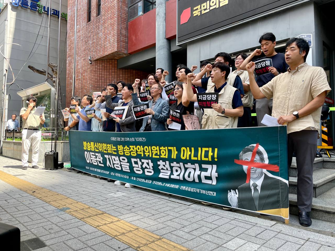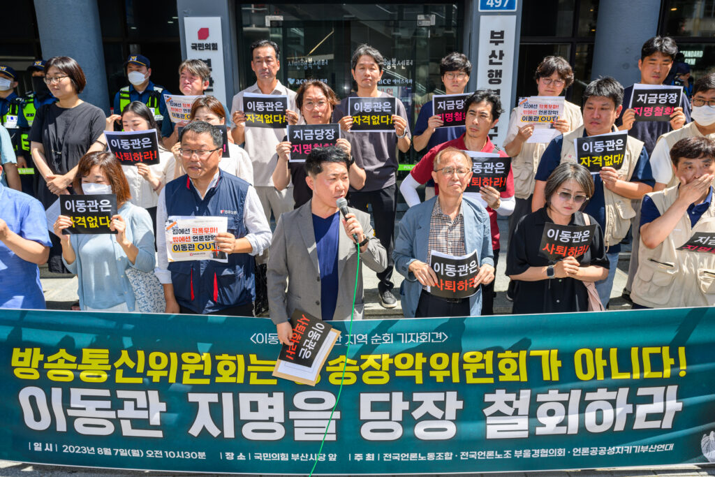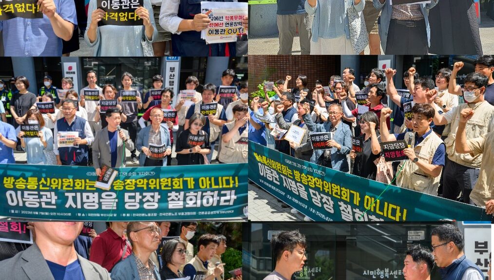 오늘(8월 7일) 부산민언련을 비롯한 부산시민사회는 전국언론노동조합(이하 언론노조)이 진행하는 <이동관 방송통신위원장 후보자 지명 철회 촉구를 위한 전국 순회 기자회견>에 함께 힘을 모았습니다.