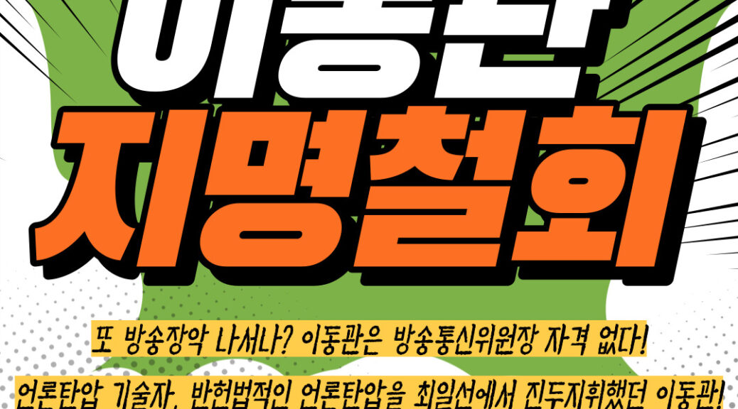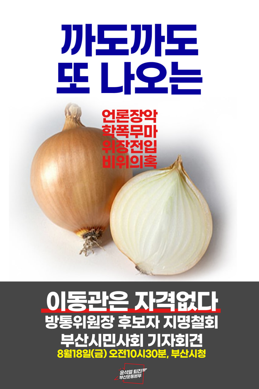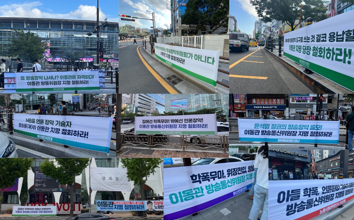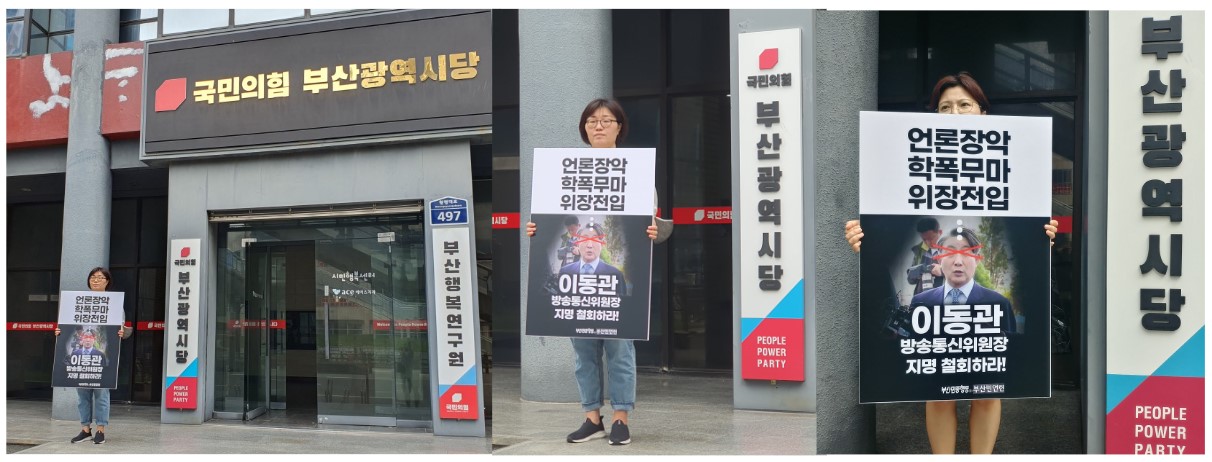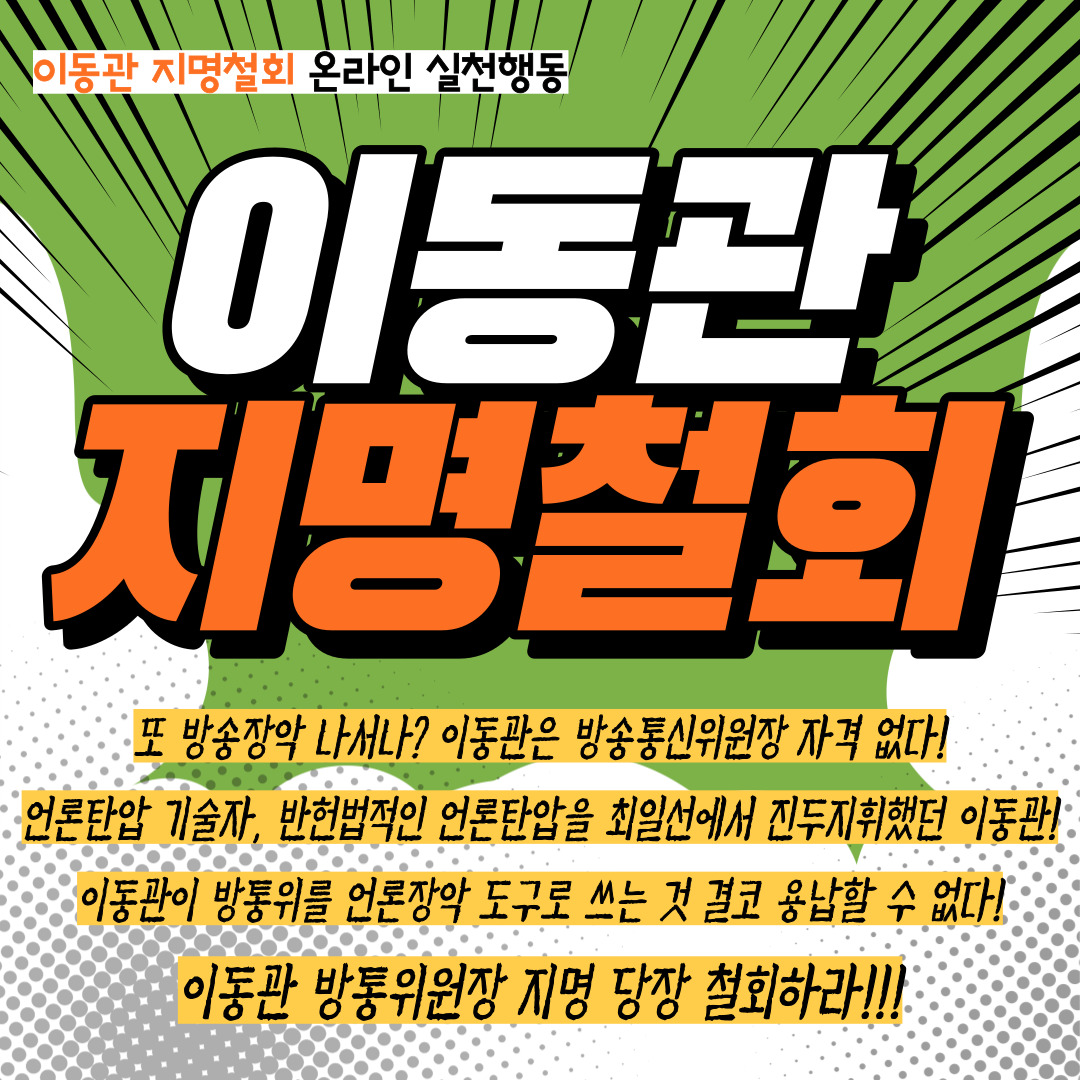 이동관 자격없다! 방통위원장 후보 지명 철회하라! 부산민언련 실천행동 8월18일 이동관 방통위원장 청문회 개최를 앞두고 있습니다. 이동관 후보자는 7월 28일 내정 발표 직후 ‘야당과 비판언론의 질책이나 비판을 겸허하게 귀 기울이겠다”고 말했습니다. 하지만 며칠도 지나지 않아 “공산당 신문·방송은 사실이나 진실을 전하는 게 아니라 주장을 전하기 때문에 언론 아니라 기관지라고 한다”며 철지난 색깔론을 꺼내들었습니다. 윤석열 정부는 취임이후 줄곧, 비판언론에 가짜뉴스 낙인을 찍어 왔습니다. 이제 윤석열 정권 방송통신위원장 지명자의 입으로부터 ‘공산당 기관지’라는 새로운 낙인이 등장한 것입니다. 뿐만 아니라, 이명박 정권 시절 언론장악을 위해 벌인 획책들이 증거물로 속속 드러나고 있습니다. 이동관 후보자가 2009년 8월 청와대 대변인 시절 이명박 대통령에 MBC 경영진 교체를 위해 여론전을 펼치겠다고 보고한 문건, 이명박 정권에 우호적인 언론인을 분류·관리하고 정권에 유리한 기사를 기획해 보도 협조를 요청했다는 문건, 홍보수석 시절엔 YTN 등 보도전문채널 보도를 모니터링한 뒤 정부에 비판적인 보도를 고치거나 자제하도록 조치했다는 내용의 문건 등 연일 언론을 통해 언론장악의 증거들이 쏟아져 나오고 있습니다. 이런 이동관 후보가 청문회 위원이 요구한 자료제출에는 ‘사생활 침해’를 이유로 자료제출을 거부하고 있다지요. ‘언론자유 침해’는 손 쉬웠던 그가 자신의 ‘사생활 침해’는 도저히 용납이 안되는 모양입니다. 이동관 후보는 방송 독립성·공공성과 방송의 자유를 지켜나가야 할 방송통신위원장으로서 자격이 전혀 없습니다. 이 후보자가 방통위원장이 된다면 그나마 유지되어온 우리 언론자유, 언론다양성 그리고 시민들의 표현의 자유는 심각하게 훼손될 것이 불을 보듯 뻔합니다. 윤석열 대통령은 언론장악 행태를 당장 멈추고, 이동관 후보자 지명을 당장 철회해야 할 것 입니다. 이동관 방송통신위원장 임명의 부당함을 알리기 위해 부산민언련은 ‘이동관 지명철회’를 위한 온라인 실천행동을 진행하고 있습니다. 이동관 지명철회 온라인 실천행동에 함께해 주세요. ● 언제? 2023년 8월 14일부터 8월 18일까지(청문회 개최일까지) ● 어떻게? 1. 아래의 웹 포스터를 다운받는다. 2. 웹포스터를 휴대폰 또는 패드 화면에 띄운다. 3. 웹포스터를 들고 ‘지명철회’ 의지가 담긴 포즈로 인증샷을 남겨 확산한다. 4. 인증은 부산민언련 사무국(010-3159-2802), 박정희 사무국장 개인톡에 인증샷을 첨부해 문자로 보낸다. 또는 부산민언련 페이스북 페이지 [‘이동관 지명철회’ 온라인 실천행동] 게시글에 댓글로 인증 사진을 남긴다(https://url.kr/c95gp3). *윤석열 정권의 언론장악 반대에 뜻이 있는 누구나 참여 가능합니다. ![]() ✊’이동관 지명철회’ 온라인 실천행동에 함께 한 부산민언련 회원과 활동가들 ![]() ![]() 다시금 MB시절로 돌아갈 수 없기에 ‘이동관 지명철회’를 위해 부산 시민사회가 힘을 모으고 있습니다! 1. 국민의힘 부산시당 앞, 1인시위 이어가기 ![]() 2. 이동관 지명 철회! 현수막 부착하기 ![]() 3. [안내] 이동관 방통위원장 후보자 지명철회 부산시민사회 기자회견 “까도까도 또 나오는 비위의혹 이동관은 자격없다!” – 일시: 8월18일(금) 오전10시30분 – 장소: 부산시청 광장 – 주최: 윤석열 퇴진 부산운동본부(준) * 까도까도 또 나오는 비위의혹 이동관을 상징하는 양파를 대통령실로 보내는 상징행동을 진행합니다. ![]() |