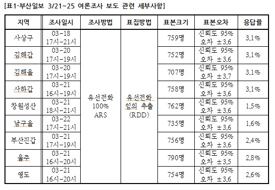 부산일보는 3월 18일부터 21일까지 격전지를 대상으로 여론조사를 실시했는데, 설문 조사방법으로 ARS 유선전화 방식을 사용했다. 그런데 유선전화만 대상으로 하는 ARS 설문조사는 특정 연령대의 과대표 문제 등 정확도가 낮아 최근에는 유무선 혼합 방식으로 대체되고 있는 실정이다.