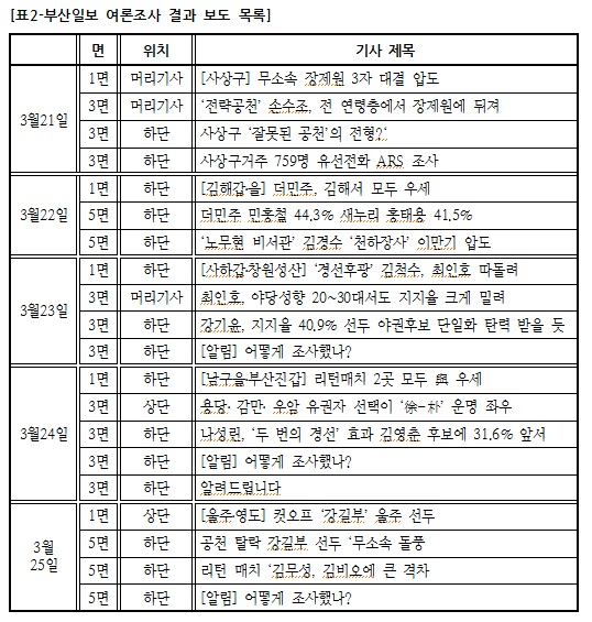 또한 경마식 보도가 심화됐다는 문제가 있다. 표2에서 알 수 있듯이 부산일보는 여론조사 결과를 후보 지지율 중심으로만 보도했다. 격전지 후보에 대한 지지도를 세대별, 연령대별, 소지역별로 상세하게 보도했다. 이번 여론조사 질문이 △투표의향 △지지후보 △당선가능성 △지지정당 △박근혜 대통령 국정운영으로 구성됐기 때문이다. 지역 이슈나 정책, 유권자의 의식 등 다양한 결과를 이끌어내는 여론조사가 진행 될 수 있음에도 승패 위주로만 접근한 점이 아쉽다.