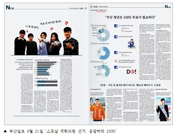 부산일보는 3월 21일 세 면을 할애해 ‘스무살 국회의원 선거, 응답하라 2030’ 기획기사를 실었다. <스무살 국회의원 선거, 응답하라 2030> <“부산청년은 100% 투표가 필요하다>, <”지역 청년은 정치 취약계층…잘난 후보들은 신경 안 써“> 보도에서 지역사회에서 활동하는 2030청년들과 좌담회를 열어 청년들이 처한 상황과 정치에 대한 관심을 다뤘다. 단순나열식 보도가 아니라 청년 당사자로부터 심층적인 목소리를 담고자 시도했고, SNS를 활용해 지역 청년들의 여론을 소개했다. 또한 <25세… 가진 것 없지만 패기 하나로 ‘헬조선 깨부수기’ 도전장>은 20대 총선에 출마한 청년 후보자들을 인터뷰했는데 그동안 양대정당, 유력한 후보들만 부각되던 것과 달리 약소, 신진 인물들을 조명한 것이라 주목할 만 했다.