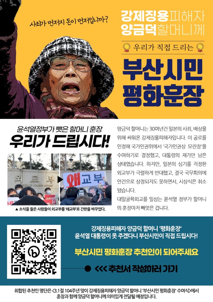 윤석열 정부가 강제징용 피해자 양금덕(94) 할머니에 대한 국민훈장 서훈에 제동을 걸자 부산 시민사회가 평화훈장 수여 추진에 나섰고 부산민언련도 함께 동참합니다. 대통령과 정부가 반대한다면 시민의 뜻을 모아 평화훈장을 대신 전달하겠다는 취지로, 다가오는 104번째 삼일절에 수여식이 진행될 예정입니다.