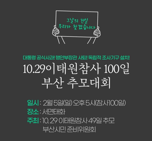 2월 5일(일), 서면 태화에서는 이태원참사 유가족과 함께 하는 100일 부산추모대회가 있었습니다. 부산민언련 회원들도 유가족분들에게 작은 힘이라도 되고자 함께 했습니다.