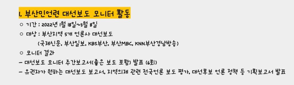 새로운 언론비평의 틀을 만들어 바람직한 선거보도를 견인해 나가고자 합니다.