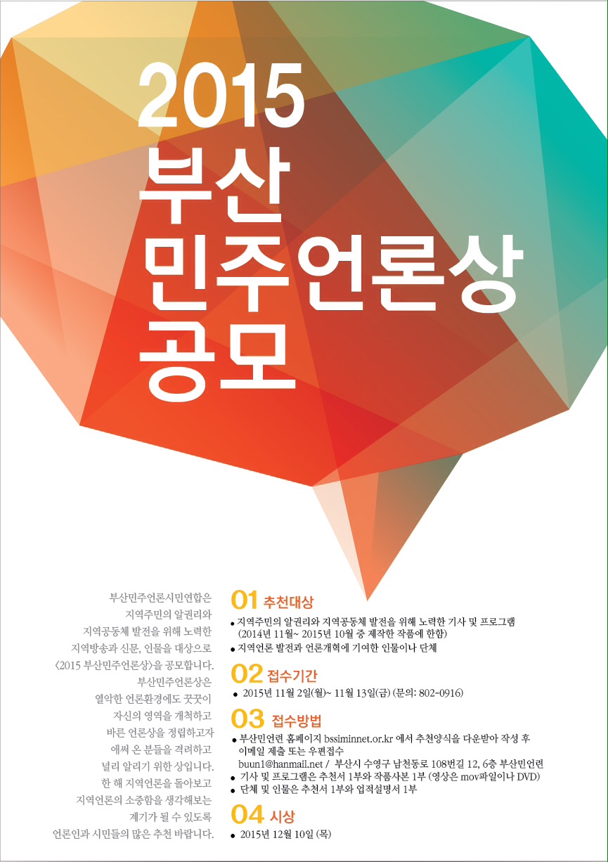 공지사항 2015 부산민주언론상 공모 2015-10-28 bssiminnet Leave a comment 2015 부산민주언론상 공모 2015년 지역 언론을 돌아보고, 바른 언론의 의미를 되새길 수 있도록 많은 관심과 추천 부탁드립니다. * 추천서 양식 2015 부산민주언론상_추천서_양식 부산민주언론상_업적설명서_양식