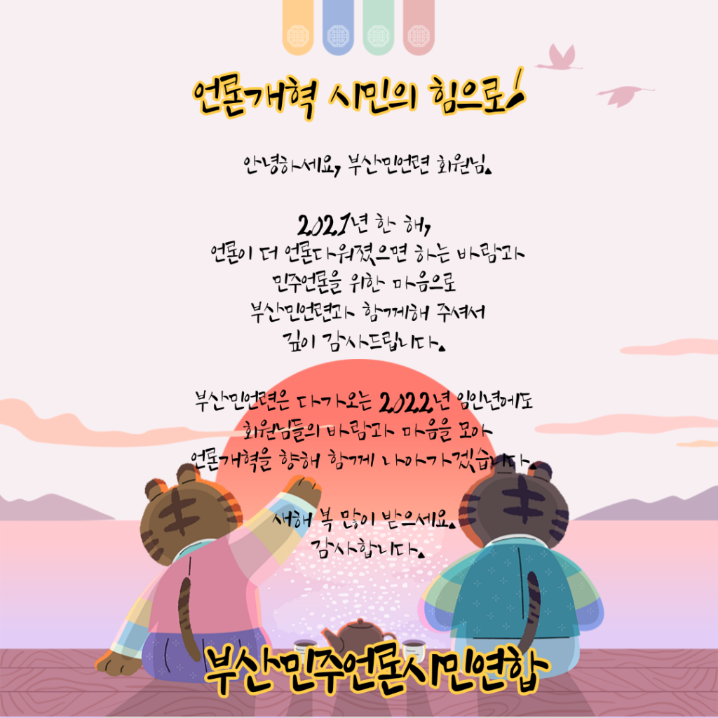 공지사항 2021년 한 해 부산민언련과 함께해 주셔서 감사합니다 2021-12-30 bssiminnet Leave a comment 언론개혁 시민의 힘으로! 안녕하세요, 부산민언련 회원님. 2021년 한 해, 언론이 더 언론다워졌으면 하는 바람과 민주언론을 위한 마음으로 부산민언련과 함께해 주셔서 깊이 감사드립니다. 부산민언련은 다가오는 2022년 임인년에도 회원님들의 바람과 마음을 모아 언론개혁을 향해 함께 나아가겠습니다. 새해 복 많이 받으세요. 감사합니다.