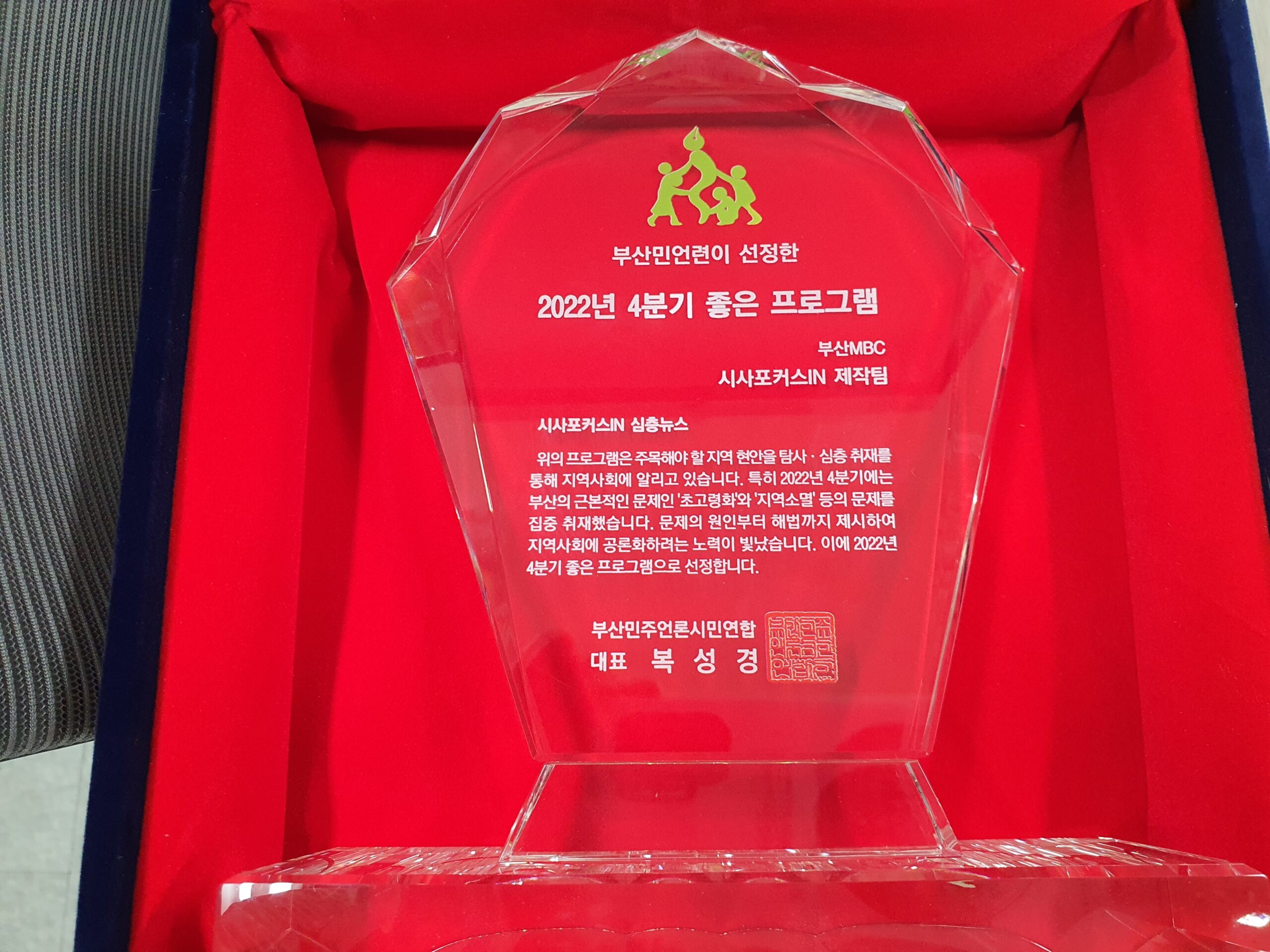 위의 프로그램은 주목해야 할 지역 현안을 탐사·심층 취재를 통해 지역사회에 알리고 있습니다. 특히 2022년 4분기에는 부산의 근본적인 문제인 ‘초고령화’와 ‘지역소멸’, ‘청년의 탈부산’ 등의 문제를 집중 취재했습니다. 문제의 원인부터 해법까지 제시하여 지역사회에 공론화하려는 노력이 빛났습니다. 이에 2022년 4분기 좋은 프로그램으로 선정했습니다.