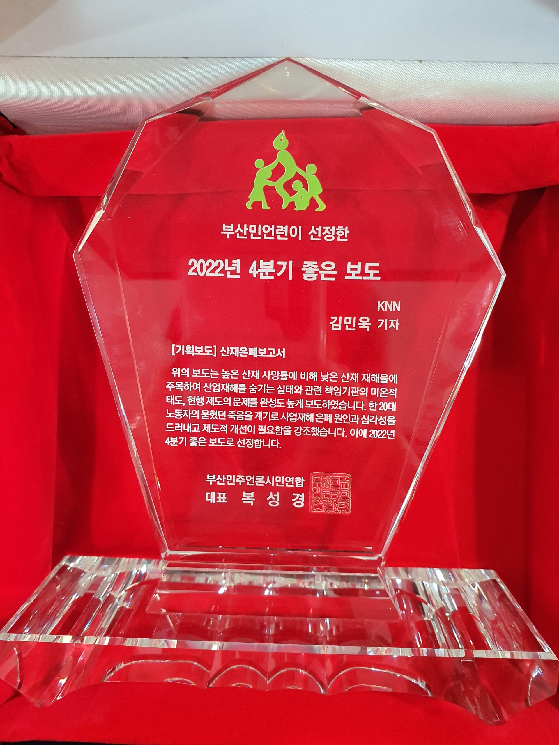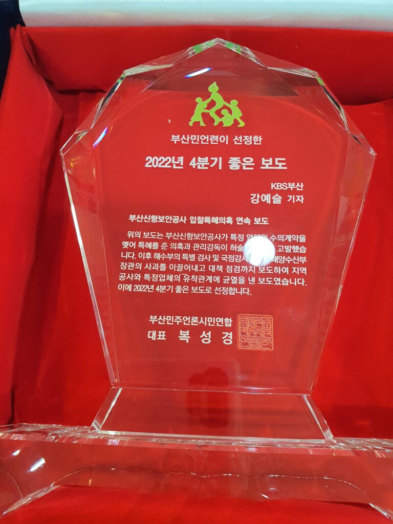 위의 보도는 부산신항보안공사가 특정 업체와 수의계약을 맺어 특혜를 준 의혹과 관리감독이 허술했던 점을 고발하여 이후 해수부의 특별 검사 및 국정감사에서의 해양수산부장관의 사과를 이끌어내고 대책 점검까지 보도하여 지역 공사와 특정업체의 유착관계에 균열을 낸 보도였습니다. 이에 2022년 4분기 좋은 보도로 선정했습니다.