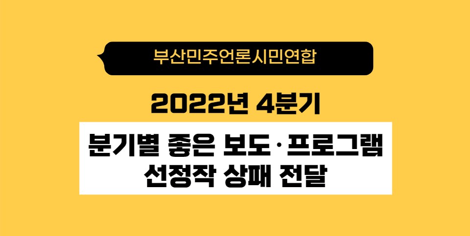 2022년 4분기 좋은 보도·프로그램으로 KBS부산 <부산신항보안공사 입찰특혜의혹 연속 보도>(강예슬 기자), 부산MBC <시사포커스IN_심층뉴스>(정은주, 조재형 기자 외), KNN <기획보도 산재은폐보고서>(김민욱 기자)를 선정했습니다.