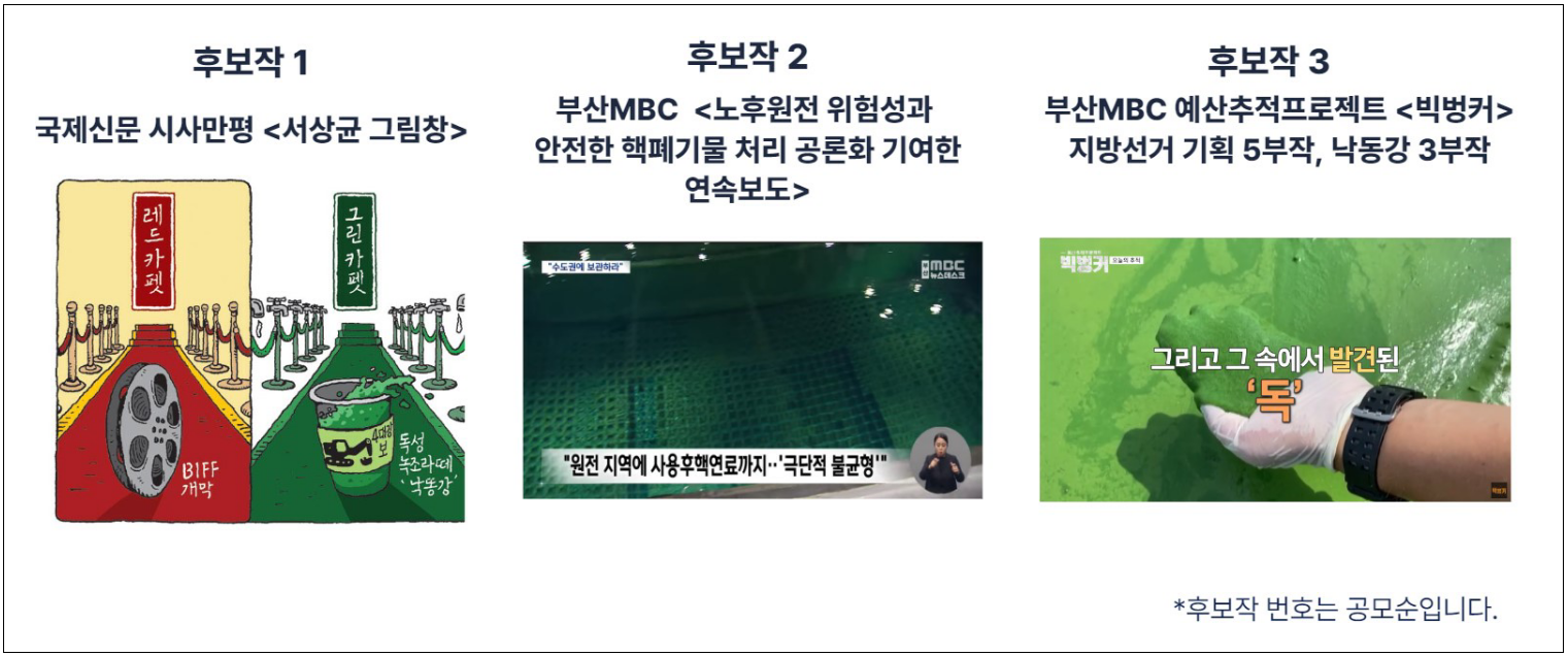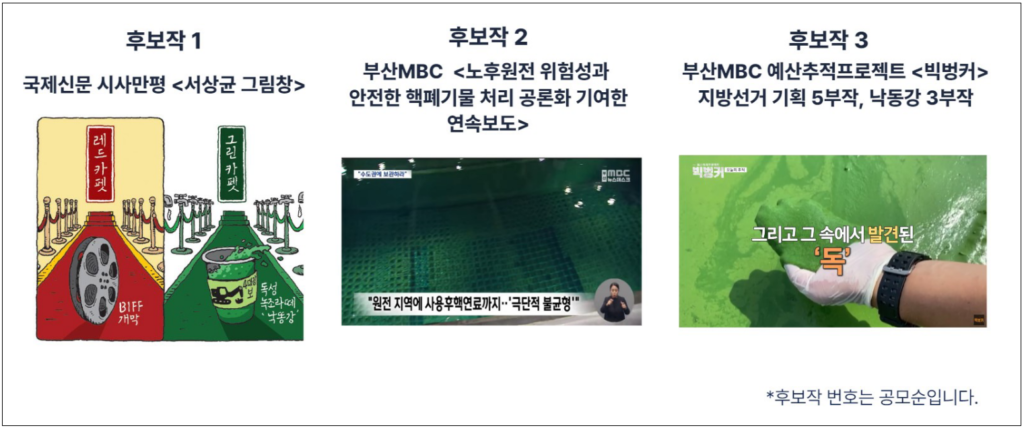 11월 1일부터 11월 15일까지 지역 언론, 지역 시민사회, 지역민을 대상으로 공모를 진행했습니다. 총 11편의 공모작 중 11월 21일 심사위원회 1차 심사를 통해 결선작 3편을 선정했습니다. 결선작으로는 국제신문 시사만평 <서상균 그림창>, 부산MBC <노후원전 위험성과 안전한 핵폐기물 처리 공론화 기여 연속보도>, 부산MBC 예산추적프로젝트 <빅벙커>가 올랐습니다.
