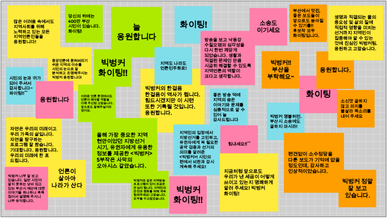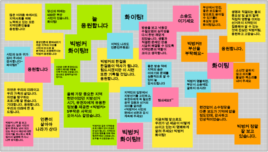 2018년 빅벙커 초기부터 함께해 오고 있는 조혜민 작가는 꽤 오랜 시간 제작해 온 소회와 함께 취재가 힘들지만 점차 빅벙커와 부산MBC를 응원해 주는 시민들이 많아지고, 오늘 부산민언련 회원들의 응원과 메시지를 보며 “힘들어도 해야하는 이유가 있는 거다.”라는 생각이 들었다고 말했습니다. 끝으로 응원에 대한 감사의 마음을 전했습니다.
