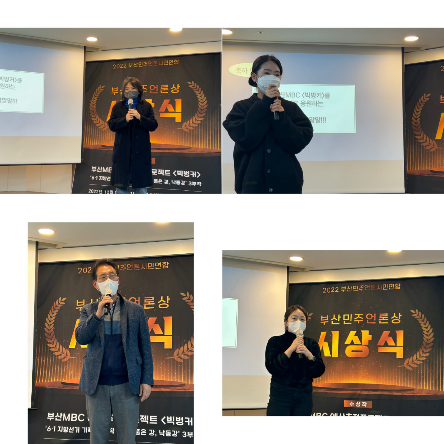 먼저, 부산민언련 장길만 운영위원님은 부산MBC는 2019년부터 4회 연속으로 부산민주언론상을 수상하고 있다며 너무 잘하는 것 아니냐는 너스레와 함께 이번에도 회원 투표의 51%를 차지했을 정도로 지역사회에서 언론의 역할을 잘 해주고 있다고 칭찬했습니다.