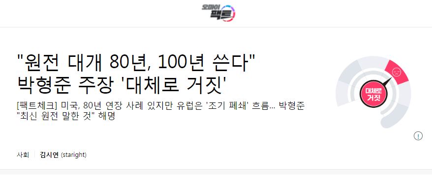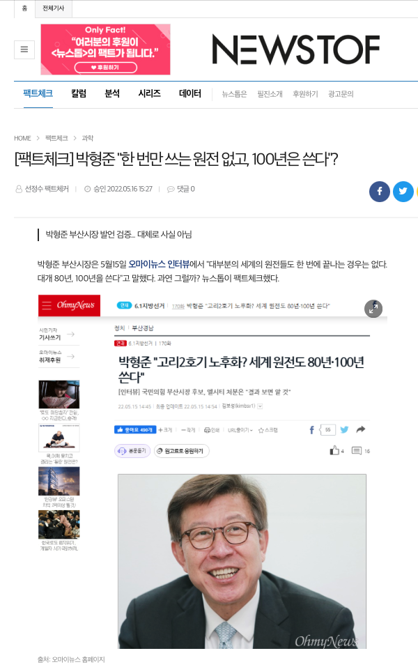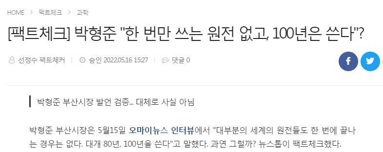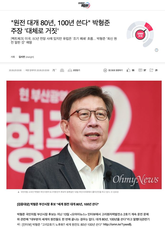 오마이뉴스 <“원전 대개 80년, 100년 쓴다” 박형준 주장 ‘대체로 거짓’>(2022.05.23.)
