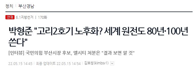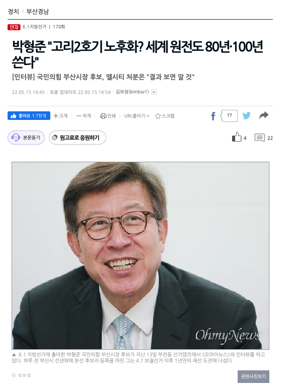 오마이뉴스 <박형준 “고리2호기 노후화? 세계 원전도 80년 ·100년 쓴다”>(2022.05.15.)