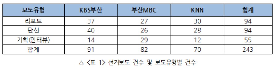 지방선거 관련 보도건수는 총 243건으로 리포트 94건, 기획보도 55건, 단신 94건이었다. 방송사별로는 KBS부산 91건, 부산MBC 82건, KNN 70건으로 KNN의 경남 지역 선거보도를 모니터대상에서 제외한 점을 감안하면 방송 3사가 비슷한 건수로 지방선거 관련 보도를 내보냈다. 하지만 각 방송사의 보도유형에서 KBS부산은 단신이 44%(40건), 부산MBC은 기획보도가 35.4%(29건), KNN은 리포트가 42.9%(30건)으로 각각 가장 높은 비율을 차지하고 있었다. 이는 KBS부산은 선거일정 및 선거 사무와 관련된 단순 정보를 많이 전달했고, 부산MBC는 지방선거의 의미와 문제점을 짚은 기획물을 많이 선보인 결과다. 반면 KNN은 기획보다는 일반적인 리포팅 기사를 통해 지방선거에 출마한 후보와 정책을 짚어보는데 집중하는 경향을 보였다.