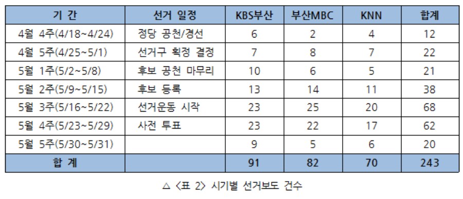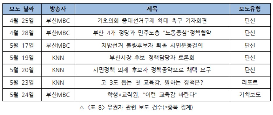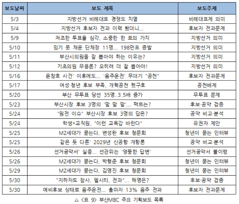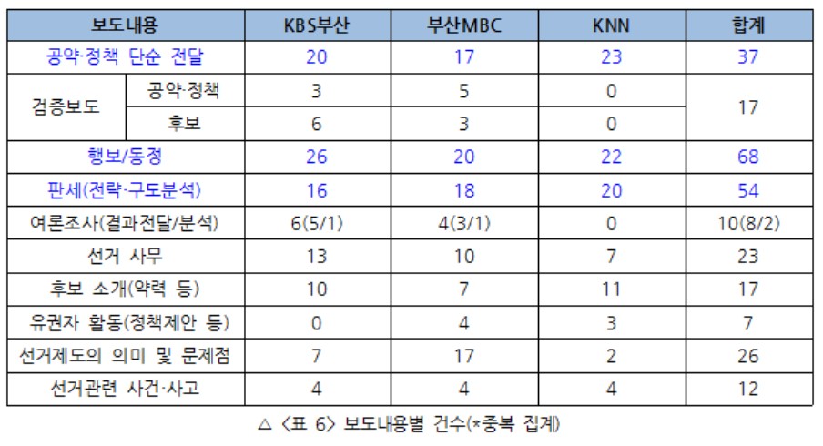 지역민에게 다양한 선거정보를 전달하고 후보와 공약의 검증 역할을 담당해야 할 시기에 지역의 대표 공영방송인 KBS부산이 타 방송사와 차별화된 선거보도를 하지 못한 점은 큰 아쉬움으로 남는다.