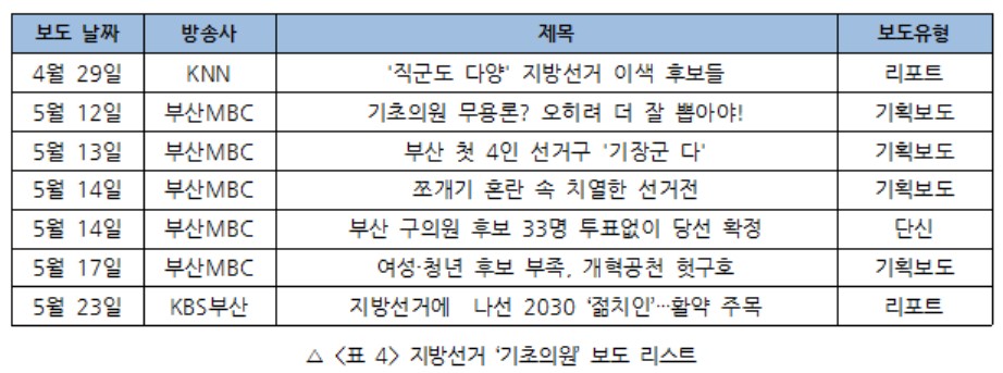 지방선거는 시장, 구·군청장 등 지방자치단체장 뿐만 아니라 시의회와 구·군의회의 비례대표를 뽑기 위한 지지 정당 투표도 있다. 특히 시의회 비례대표에는 더불어민주당, 국민의힘, 정의당, 기본소득당, 진보당, 한류연합당 6개 정당이 후보를 냈다. 하지만 지역방송은 부산시장 후보가 출마한 정당만 집중적으로 보도했고 비례투표 대상인 군소정당에 대한 보도는 심각할 정도로 찾아보기 힘들었다. 시장이나 기초단체장에 출마한 후보가 없는 정당이더라도, 유권자의 알권리를 위해 비례 투표 대상이 되는 정당에 대한 기본적인 정보를 전하는 것이 마땅함에도 불구하고 지역방송은 소홀했다.