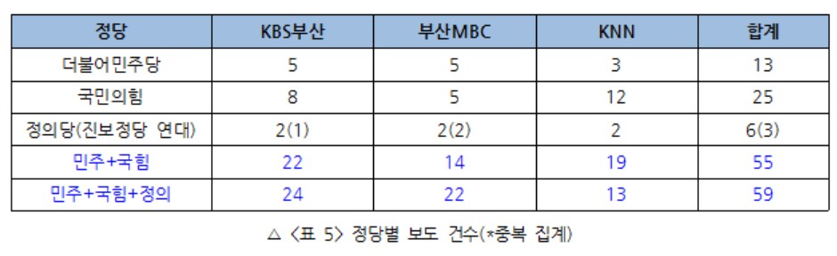 정당별 보도 건수는 더불어민주당, 국민의힘, 정의당이 함께 등장하는 보도가 59건으로 가장 많았는데, 이는 부산시장 후보 선거 보도에서 3명의 후보를 모두 언급한 경우가 해당된다. 다음으로 더불어민주당과 국민의힘 동반 보도가 55건으로 뒤를 이었는데, 기초단체장 후보를 소개하는 보도에서 양당이 함께 언급된 경우이다. 특히 정당별 단독보도에서 국민의힘 보도가 25건으로 가장 많았는데, 지역방송이 공천·경선 시기에 국민의힘 갈등에 집중했기 때문인 것으로 분석된다. 더불어민주당은 13건, 정의당과 진보정당 연대는 9건으로 나타났다.