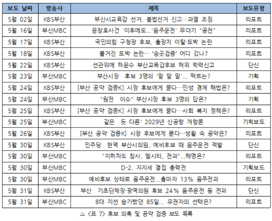 KBS부산은 <부산시교육감 선거, 불법선거 신고…과열 조짐>(5/2), <[부산 공약 검증K] 시장 후보에게 묻다>(5/24, 5/25, 5/26) 등을 통해 교육감 후보의 공방 사실관계를 확인하고, 시장 후보의 공약을 비교, 선거보도 자문단의 평가를 담았다. 하지만 공약자문단 평가가 각 후보별 공약 실현가능성 점검 등의 구체적인 분석보다 ‘공약 한 줄 평’ 수준에 머무는 한계를 보였다.