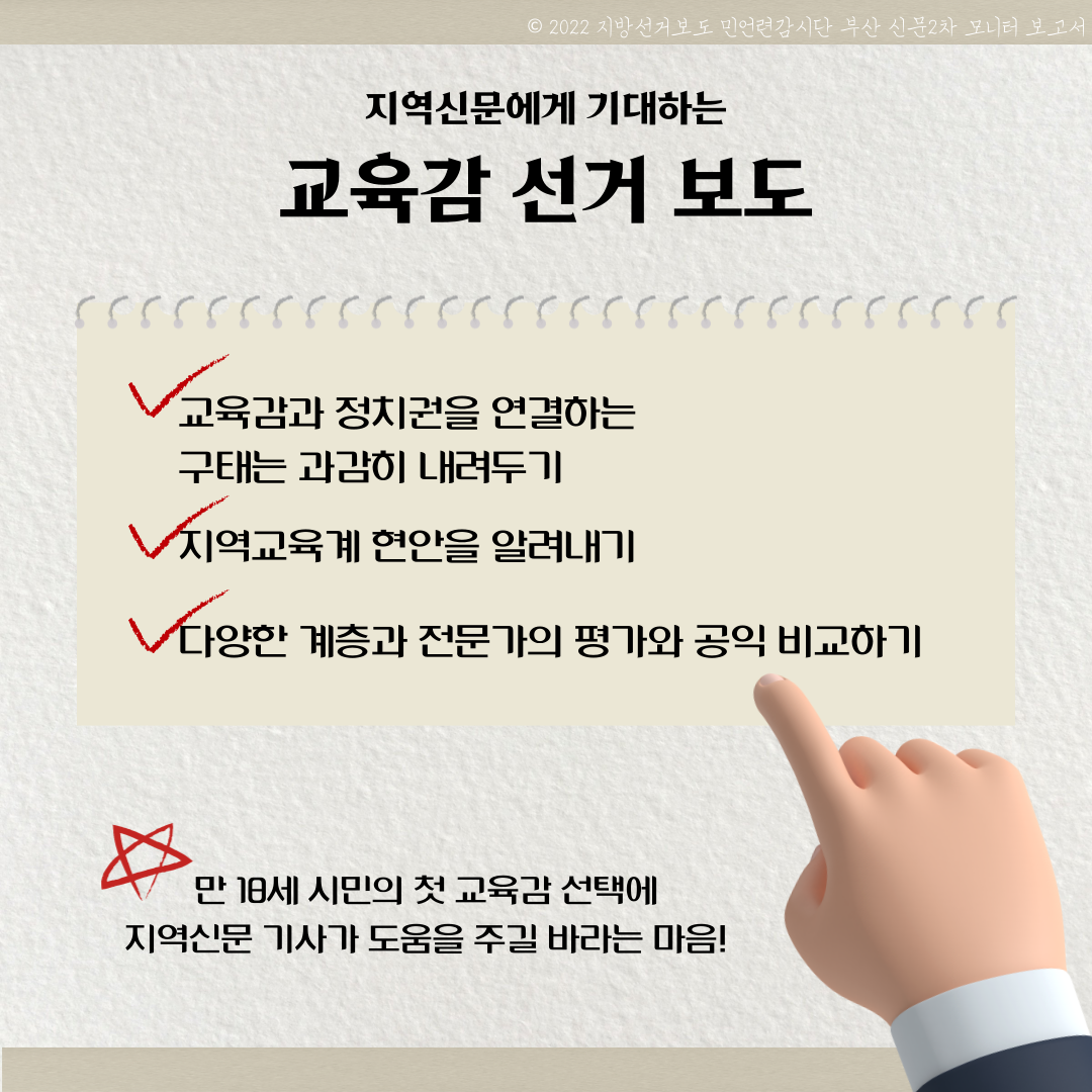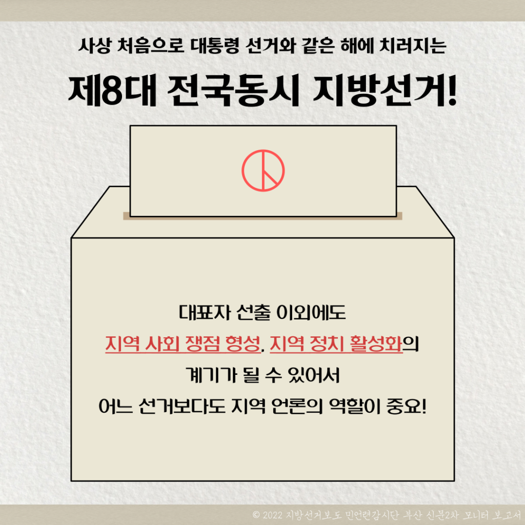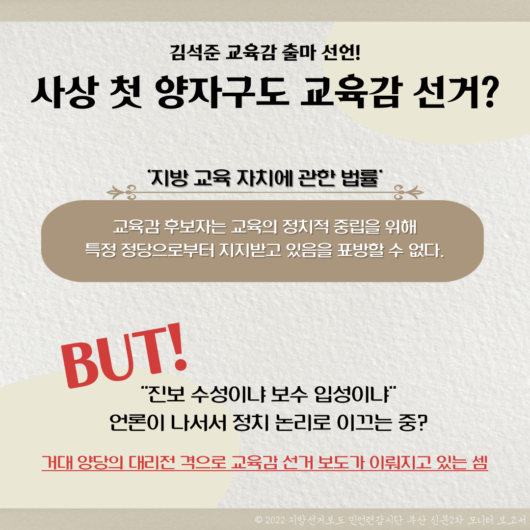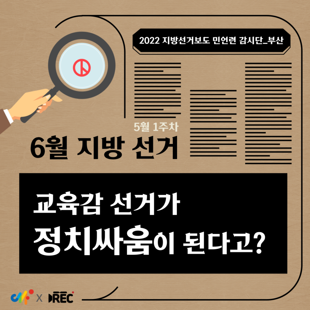 활동소식 [2022 지방선거 보도 카드뉴스]신문1. 교육감 선거가 정치싸움이 된다고? / 우린 이걸 불친절한 보도로 부르기로 했어요 2022-05-07 bssiminnet Leave a comment 부산민언련은 시민모니터단과 함께 지역언론의 지방선거 보도를 모니터링하여 매주 보고서를 발행하고 있습니다.또한 부산시청자미디어센터 ‘공익콘텐츠 제작단’과의 협업으로매주 부산민언련이 발행한 보고서를 바탕으로 카드뉴스도 제작·배포하고 있습니다.그 첫번째 신문모니터 카드뉴스입니다.● 교육감 선거가 정치싸움이 된다고?● 우린 이걸 불친절한 보도로 부르기로 했어요회원분들과 시민 여러분의 많은 관심과 응원 부탁드립니다.