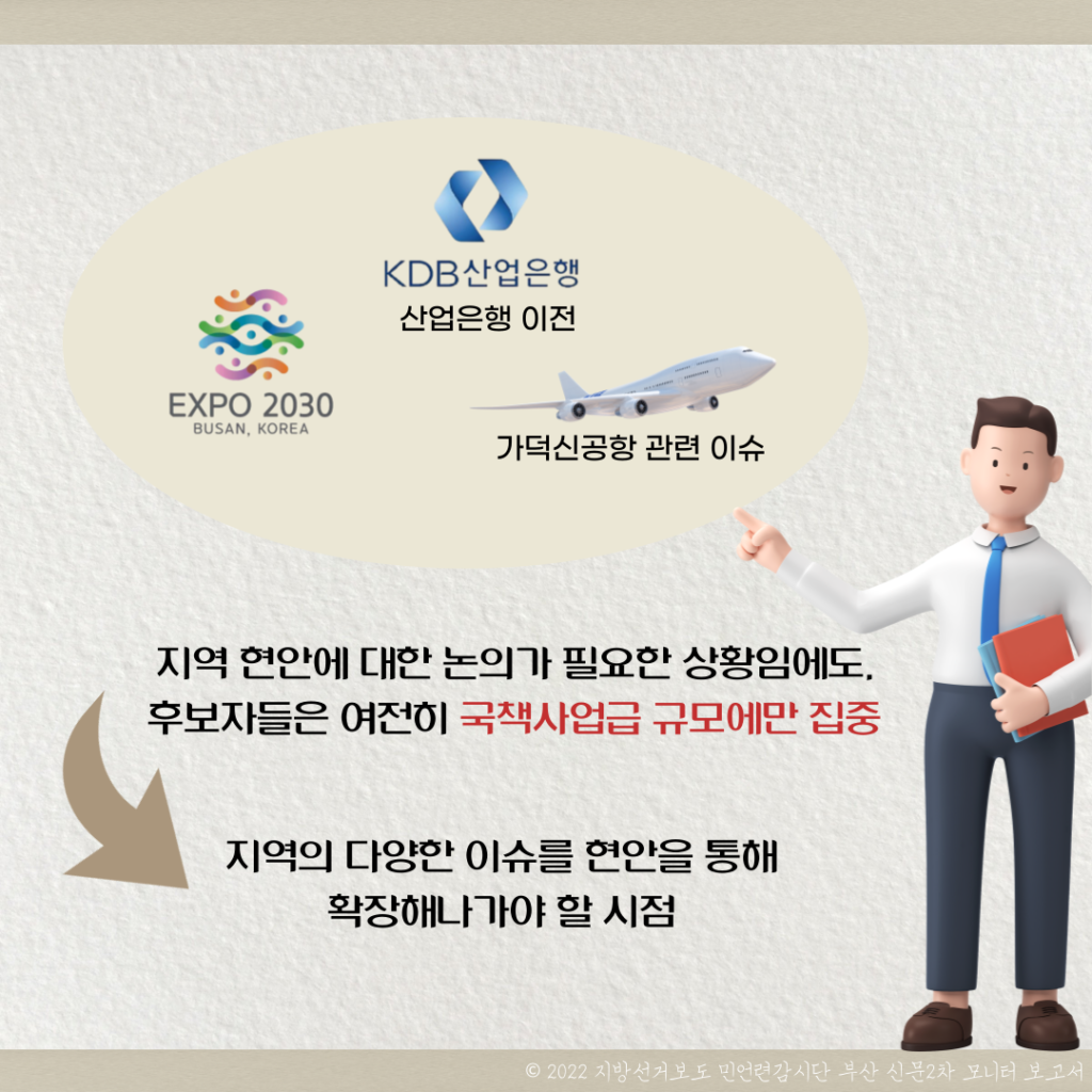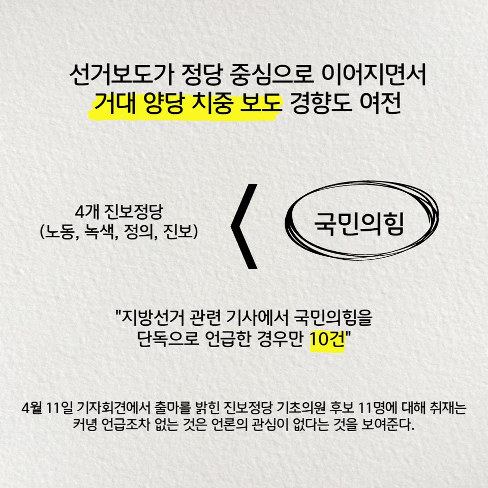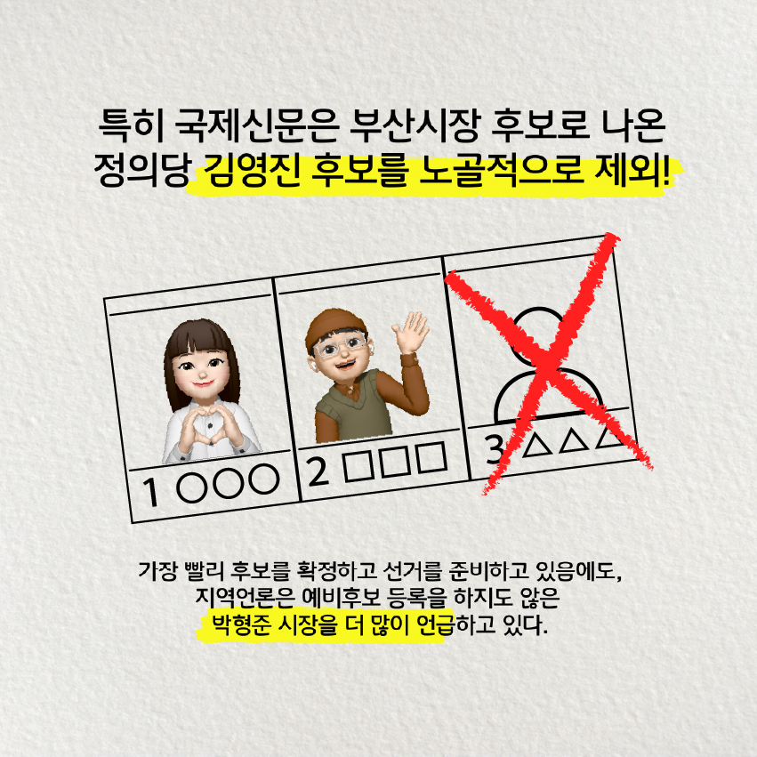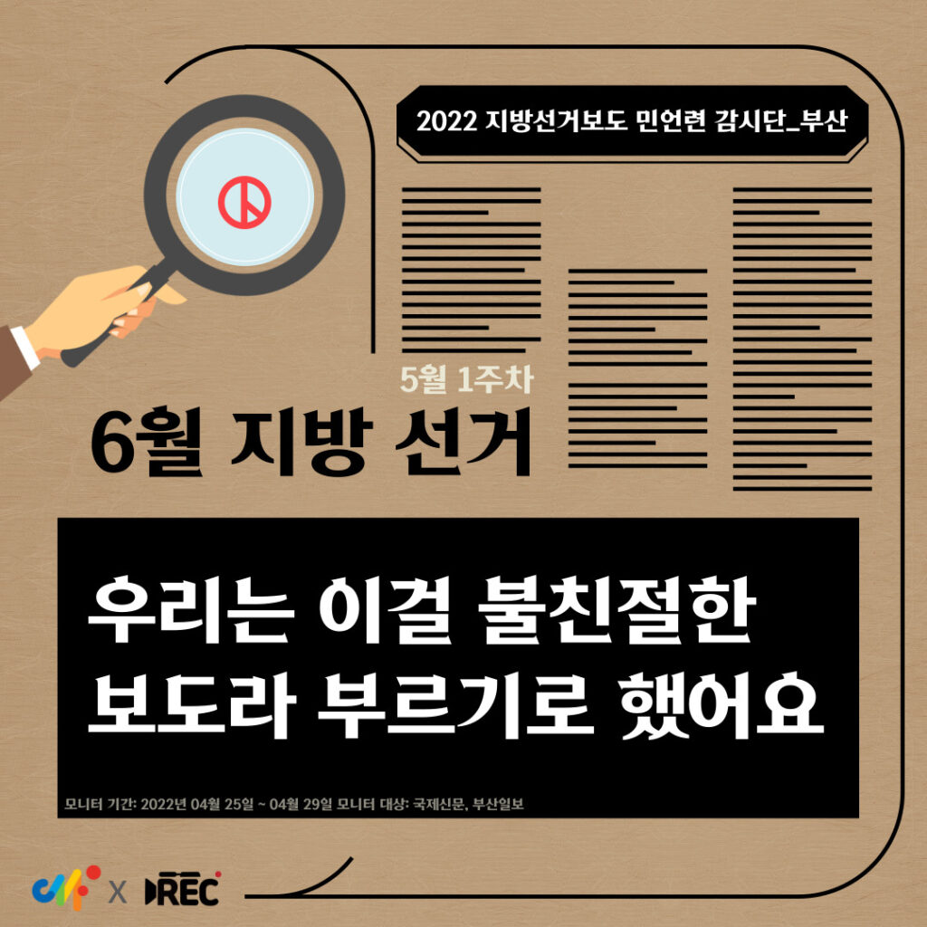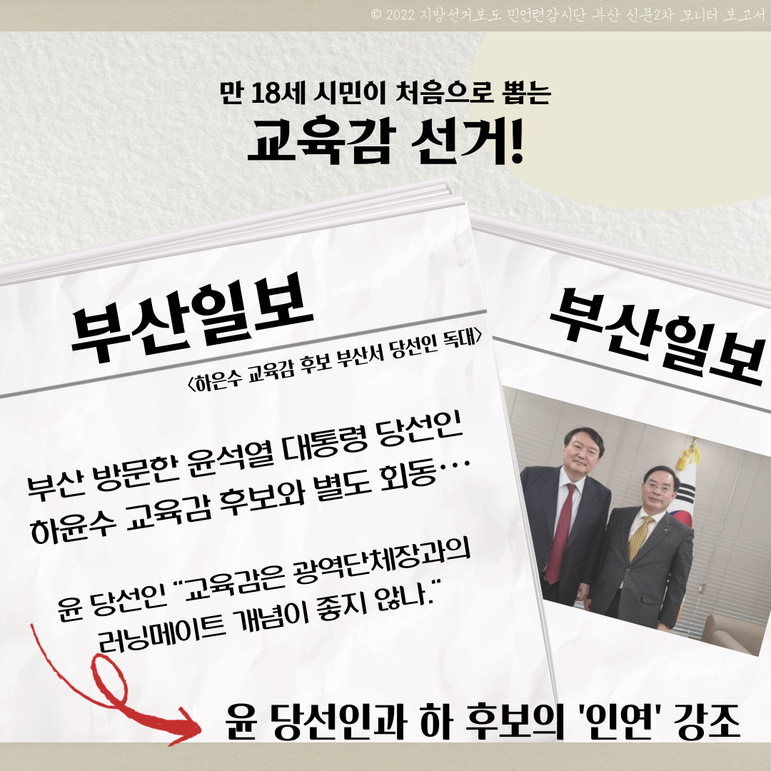 활동소식 [2022 지방선거 보도 카드뉴스]신문1. 교육감 선거가 정치싸움이 된다고? / 우린 이걸 불친절한 보도로 부르기로 했어요 2022-05-07 bssiminnet Leave a comment 부산민언련은 시민모니터단과 함께 지역언론의 지방선거 보도를 모니터링하여 매주 보고서를 발행하고 있습니다.또한 부산시청자미디어센터 ‘공익콘텐츠 제작단’과의 협업으로매주 부산민언련이 발행한 보고서를 바탕으로 카드뉴스도 제작·배포하고 있습니다.그 첫번째 신문모니터 카드뉴스입니다.● 교육감 선거가 정치싸움이 된다고?● 우린 이걸 불친절한 보도로 부르기로 했어요회원분들과 시민 여러분의 많은 관심과 응원 부탁드립니다.