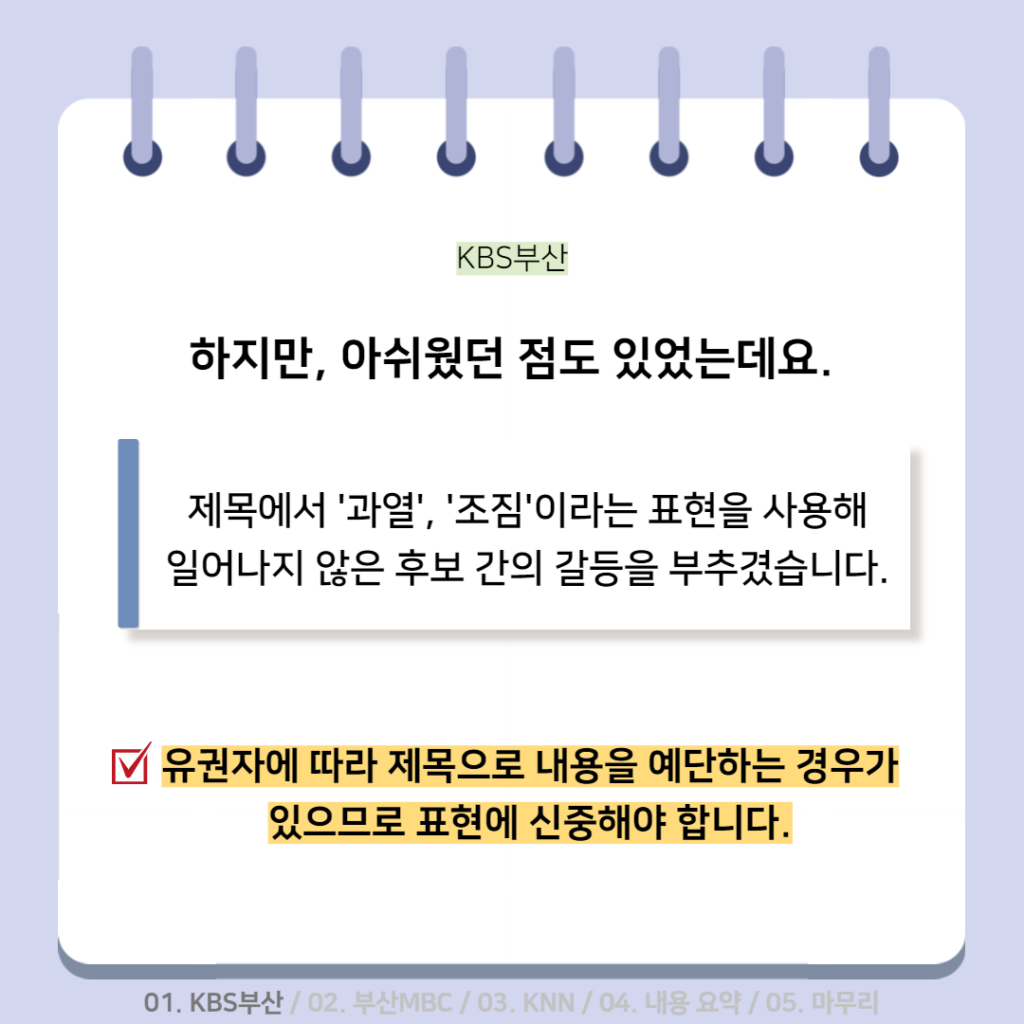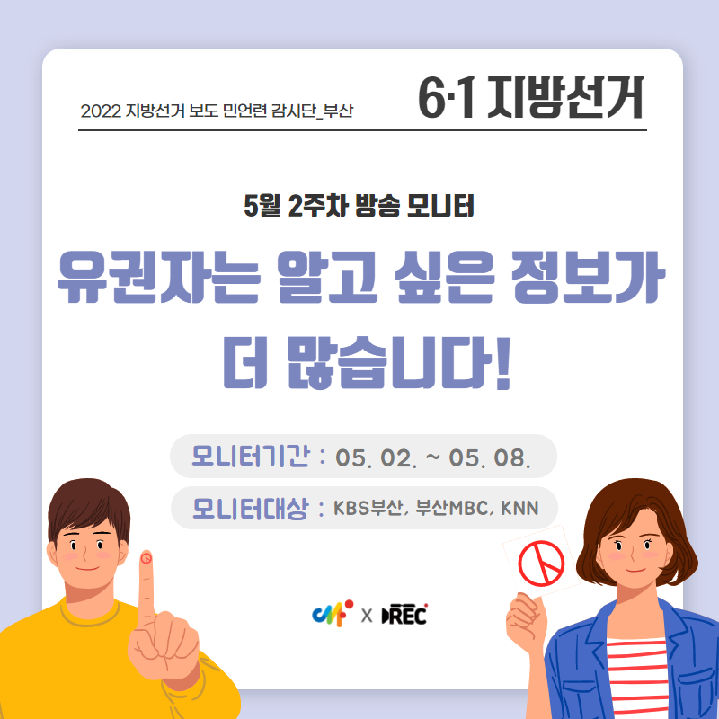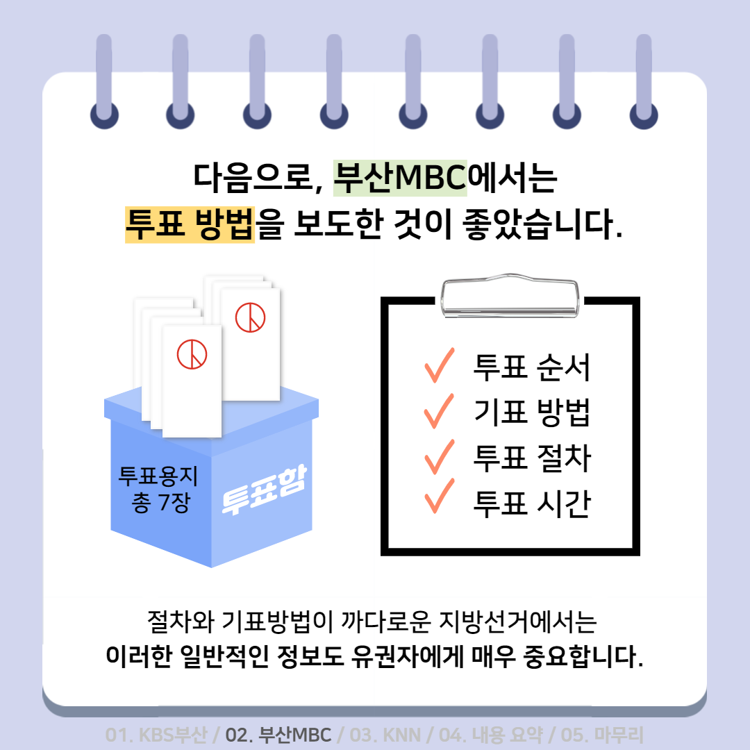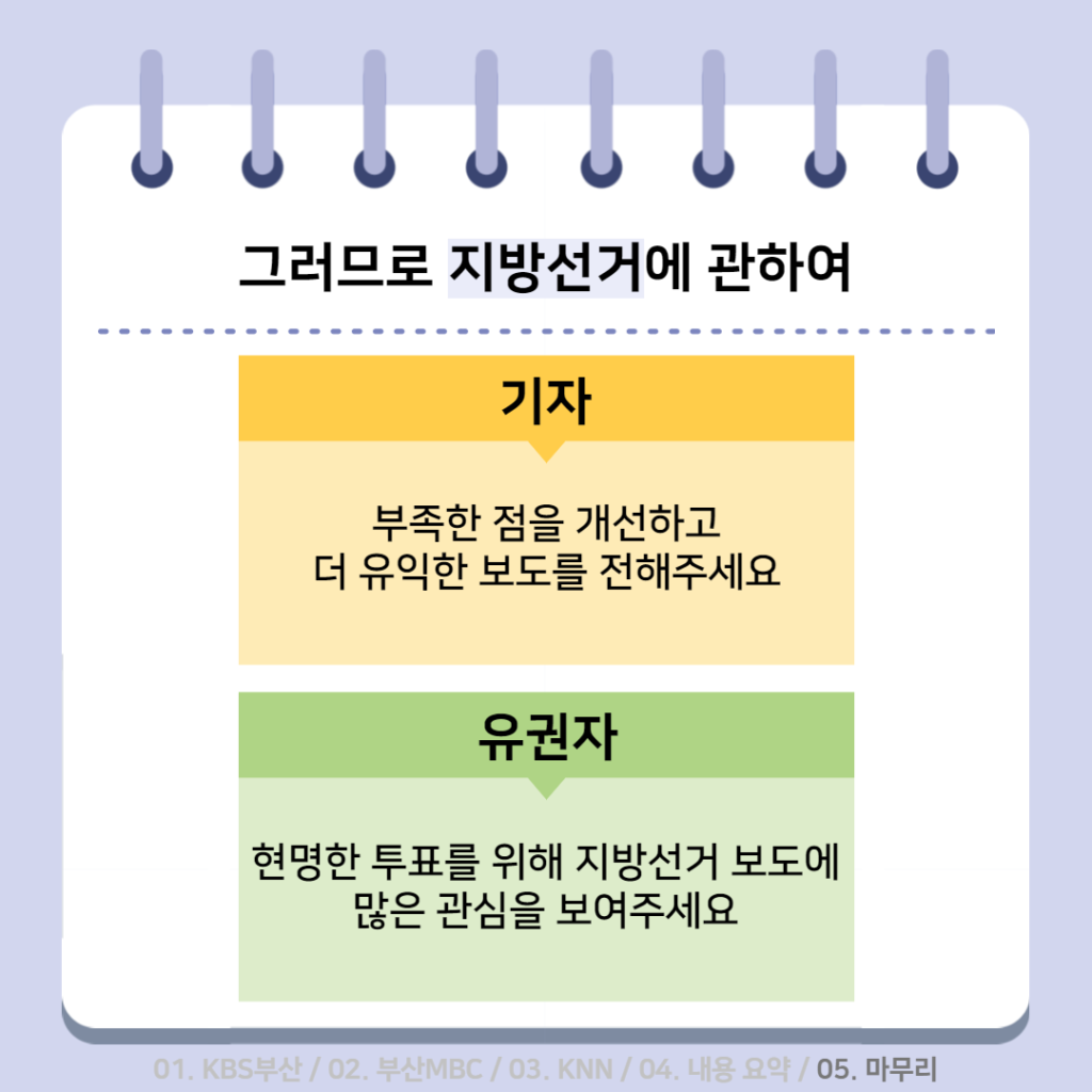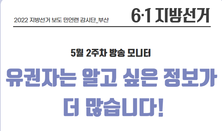활동소식 [2022 지방선거 보도 카드뉴스] 방송2. 5월 2주차 지역방송의 지방선거는 어땠을까요? 2022-05-13 bssiminnet Leave a comment 부산민언련은 5월 2주차_지방선거 방송뉴스 모니터 보고서 <공방 확인과 선거정보 제공 등 본격적인 선거보도 시작한 지역방송>을 발행했습니다.‘부산시청자미디어센터 공익캠페인 서포터즈’는 이번주에도그 결과를 바탕으로 카드뉴스를 제작했습니다. 읽기 지루할 수도 있는 보고서 내용을두 가지 버전으로 요점만 쏙쏙 담아 보기 쉽게 만들었네요.‘공익캠페인 서포터즈’ 고마워요~다음 주에도 요점 쏙쏙 카드뉴스 부탁드립니다^^