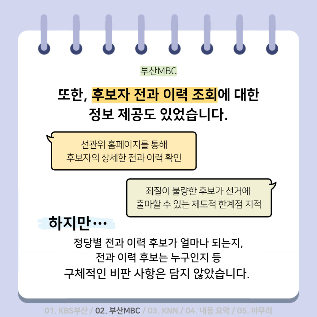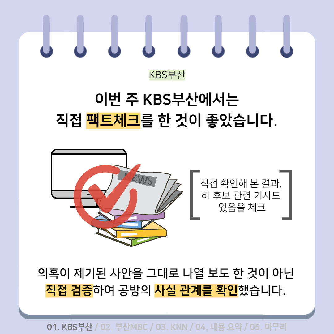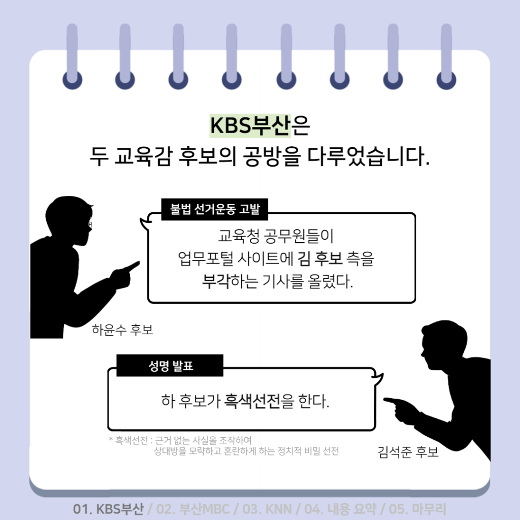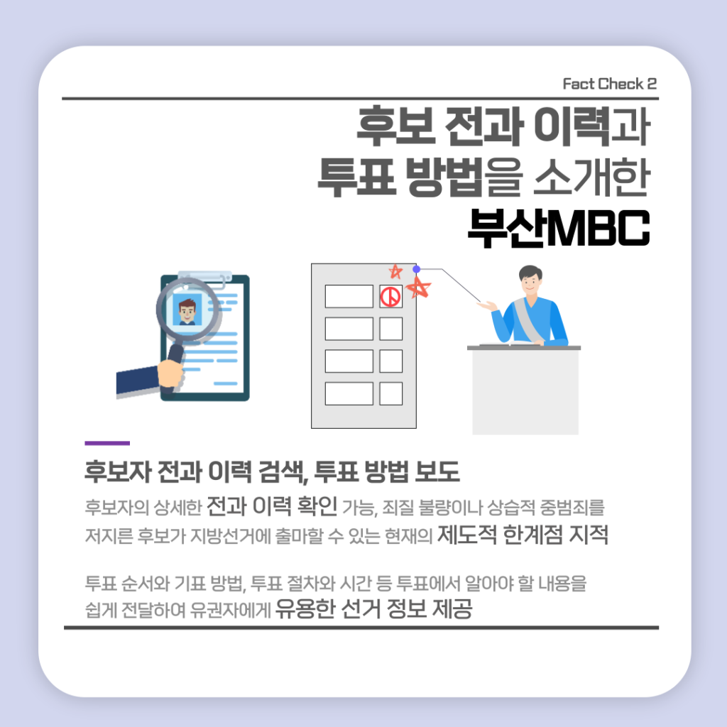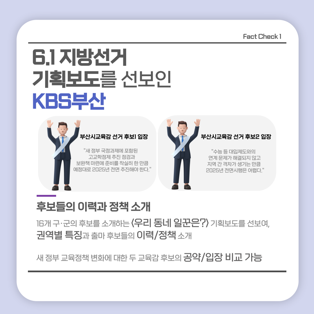 활동소식 [2022 지방선거 보도 카드뉴스] 방송2. 5월 2주차 지역방송의 지방선거는 어땠을까요? 2022-05-13 bssiminnet Leave a comment 부산민언련은 5월 2주차_지방선거 방송뉴스 모니터 보고서 <공방 확인과 선거정보 제공 등 본격적인 선거보도 시작한 지역방송>을 발행했습니다.‘부산시청자미디어센터 공익캠페인 서포터즈’는 이번주에도그 결과를 바탕으로 카드뉴스를 제작했습니다. 읽기 지루할 수도 있는 보고서 내용을두 가지 버전으로 요점만 쏙쏙 담아 보기 쉽게 만들었네요.‘공익캠페인 서포터즈’ 고마워요~다음 주에도 요점 쏙쏙 카드뉴스 부탁드립니다^^