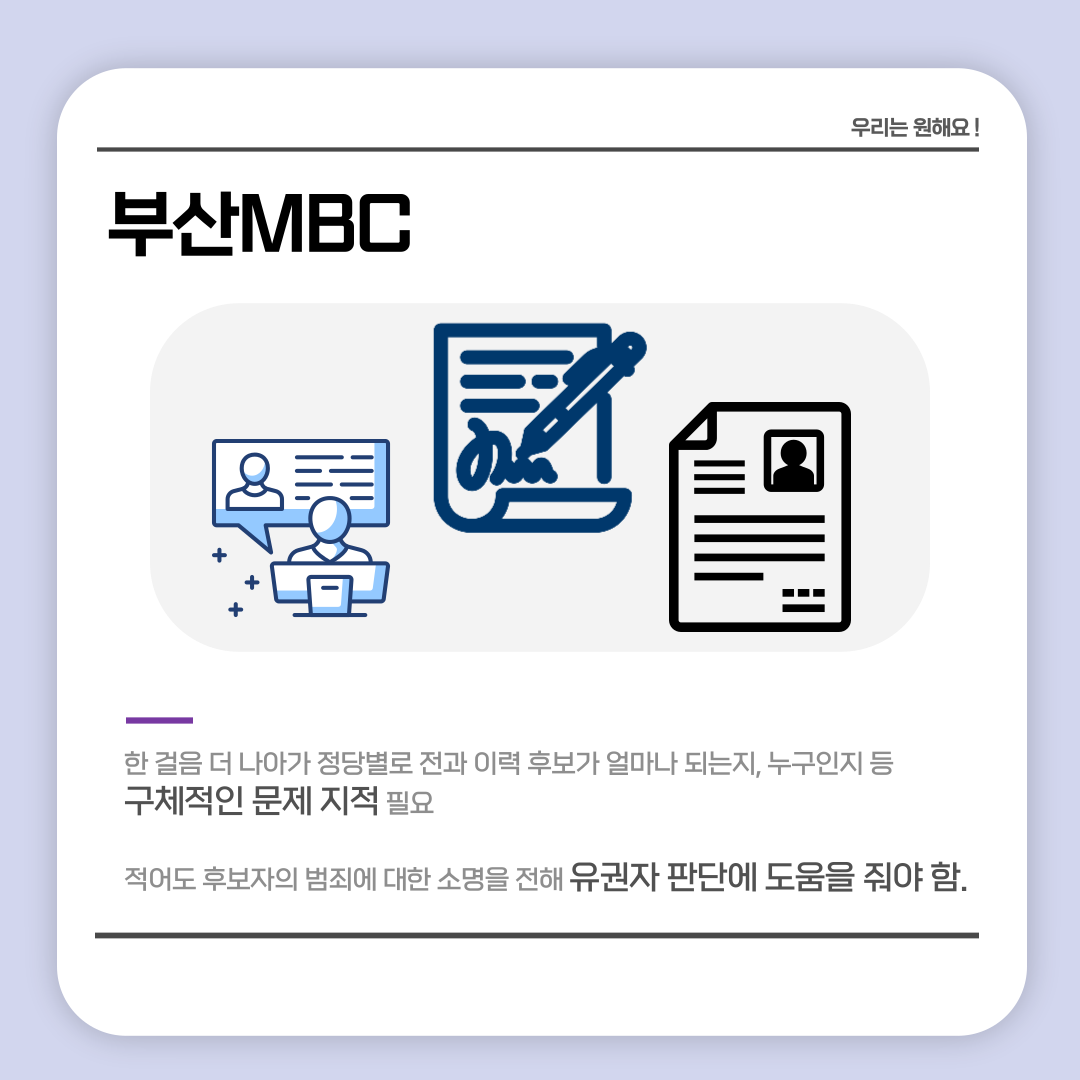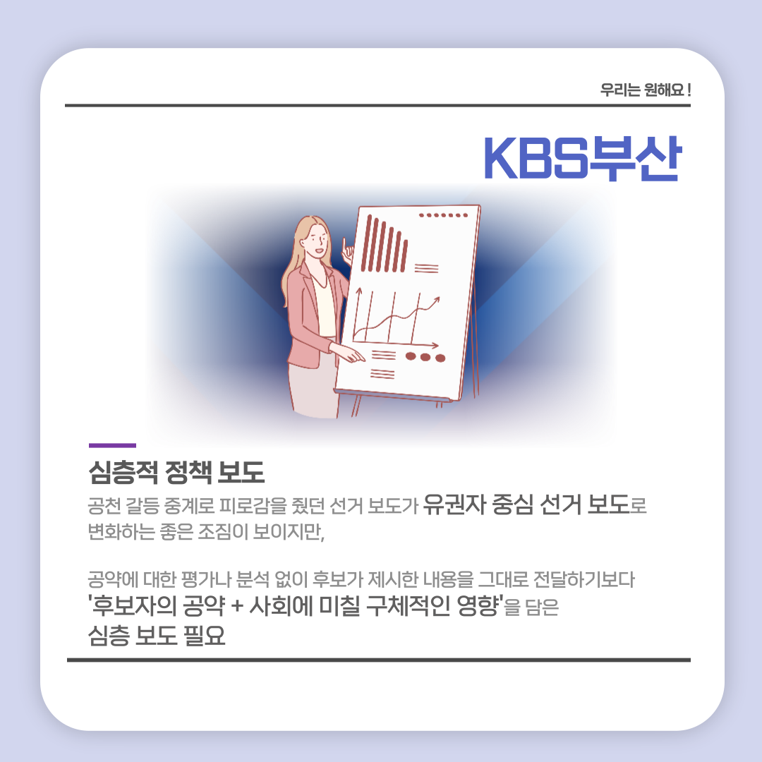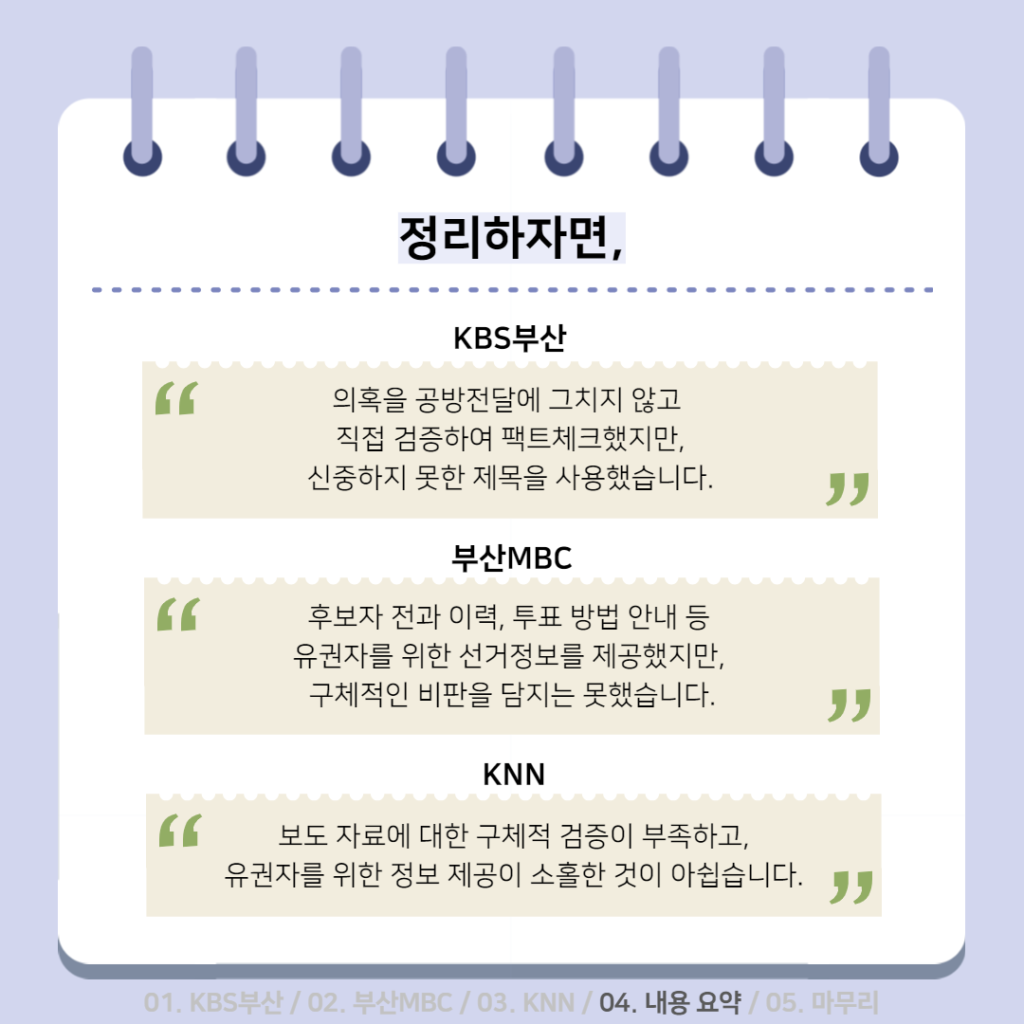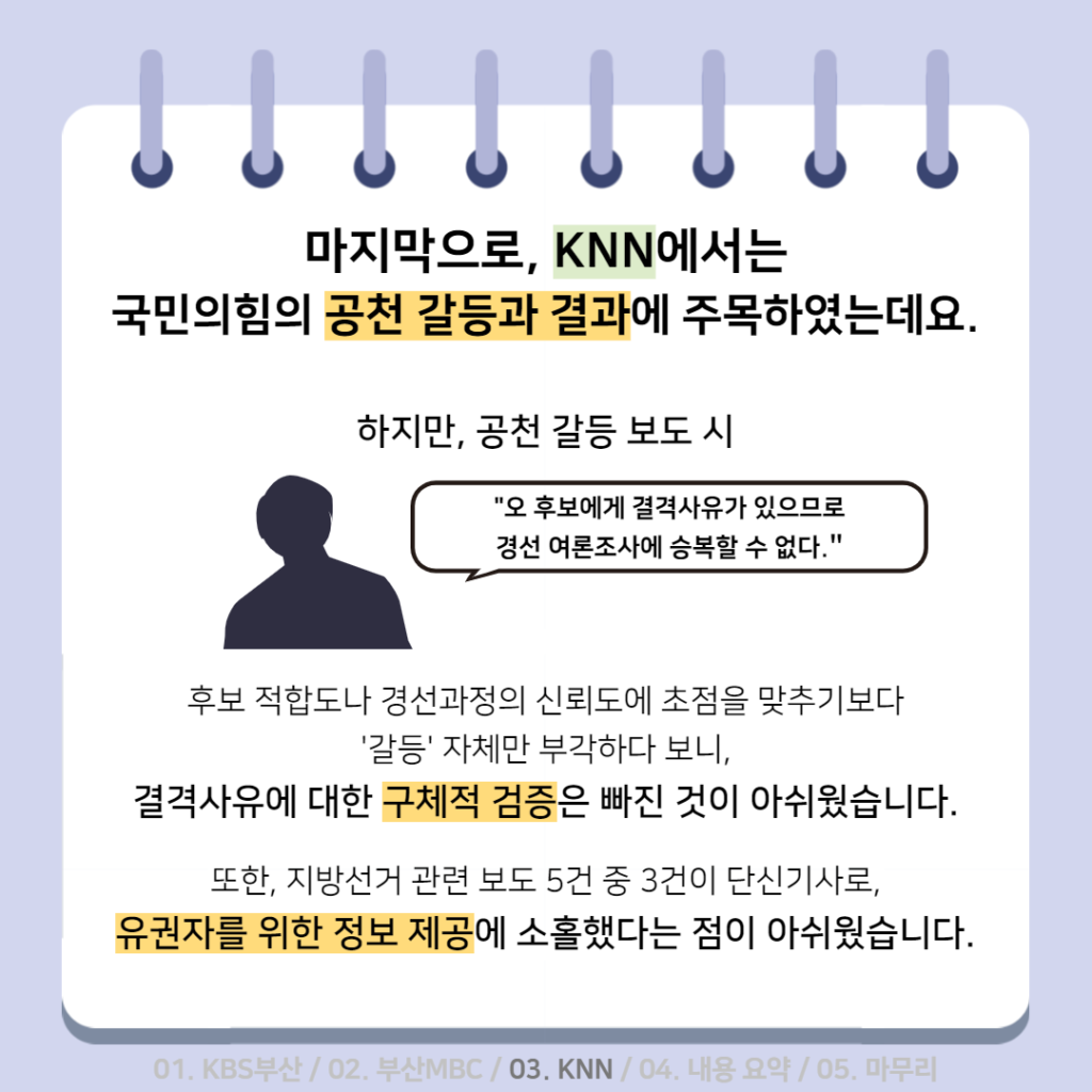 활동소식 [2022 지방선거 보도 카드뉴스] 방송2. 5월 2주차 지역방송의 지방선거는 어땠을까요? 2022-05-13 bssiminnet Leave a comment 부산민언련은 5월 2주차_지방선거 방송뉴스 모니터 보고서 <공방 확인과 선거정보 제공 등 본격적인 선거보도 시작한 지역방송>을 발행했습니다.‘부산시청자미디어센터 공익캠페인 서포터즈’는 이번주에도그 결과를 바탕으로 카드뉴스를 제작했습니다. 읽기 지루할 수도 있는 보고서 내용을두 가지 버전으로 요점만 쏙쏙 담아 보기 쉽게 만들었네요.‘공익캠페인 서포터즈’ 고마워요~다음 주에도 요점 쏙쏙 카드뉴스 부탁드립니다^^