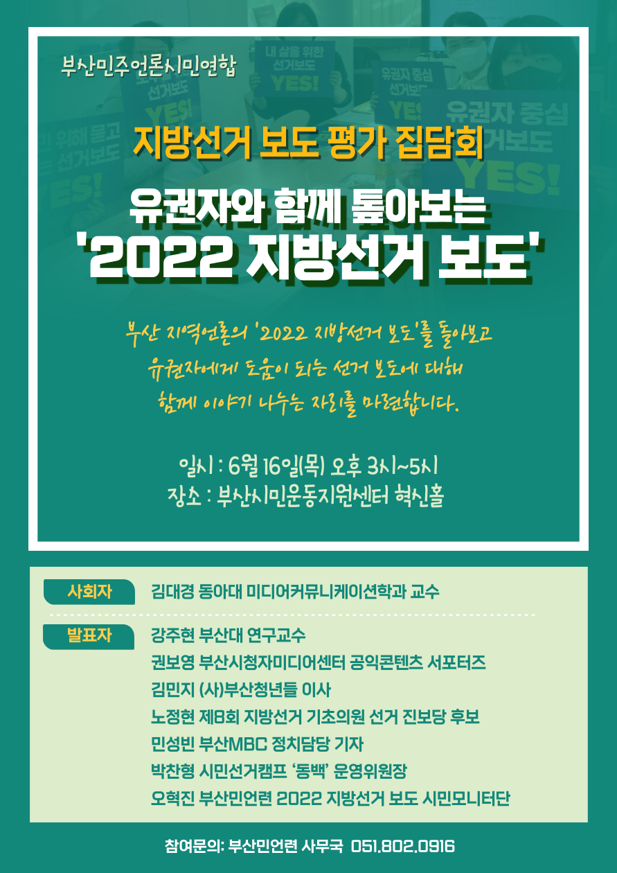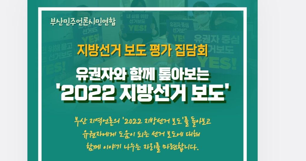 부산 지역언론의 2022 지방선거 보도를 돌아보고, 유권자에게 도움이 되는 선거 보도에 대해 함께 이야기 나누는 자리를 마련합니다. 지방선거보도 시민모니터단, 선거보도 카드뉴스 제작단, 학계, 유권자정책 제안 활동단체를 비롯한 선거보도를 관심있게 본 회원과 시민들이 유권자 중심에서 선거보도를 짚어봅니다.