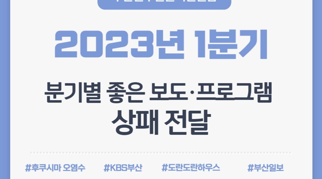 2023년 1분기 좋은 보도·프로그램으로 국제신문 <온천천 일대 균열 대심도 공사영향 점검 보도>(정지윤 기자), KBS부산 <후쿠시마 오염수 방류 금지 재판 및 부산시 대응 점검 보도>(이이슬 기자), 부산일보 <‘황혼에 만난 마지막 가족’ 기획시리즈>(변은샘 기자)가 선정되었습니다.