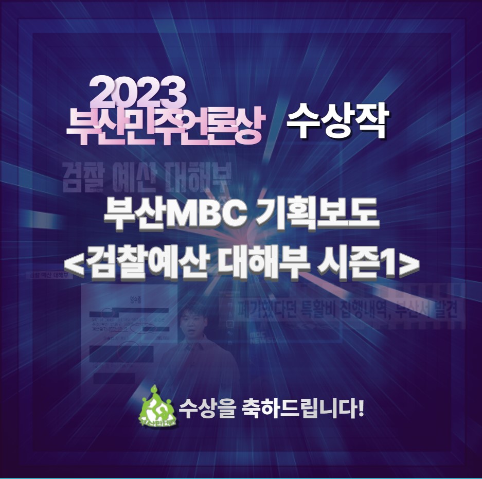 부산민주언론상을 수상한 부산MBC 기획보도 <검찰 예산 대해부 시즌1>은 부산지역 4개 검찰기관의 특수활동비와 업무추진비 등을 분석해 오남용 사례와 부실한 증빙 실태, 위법 지출 사례 등을 고발했습니다. 부산MBC와 뉴스타파를 비롯한 6개 언론이 함께 그동안 ‘감시의 성역’이었던 검찰 조직을 향한 감시의 첫발을 내딛었다는 점에서 의미 있다는 평가를 받았습니다. 특히 2만 6천여 장에 달하는 방대한 자료를 입수하고 분석하였다는 점, 비판언론에 대한 권력의 압박에도 불구하고 흔들림 없이 취재 보도한 점이 높은 평가를 받았고, 검찰개혁을 향한 시민의 열망을 수렴한 보도로 전폭적인 지지를 얻었습니다.