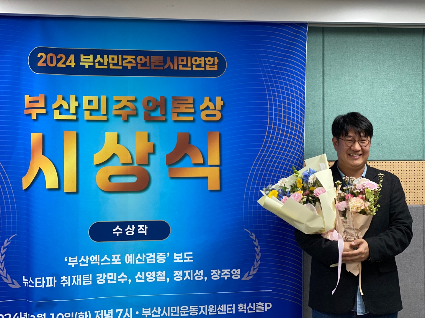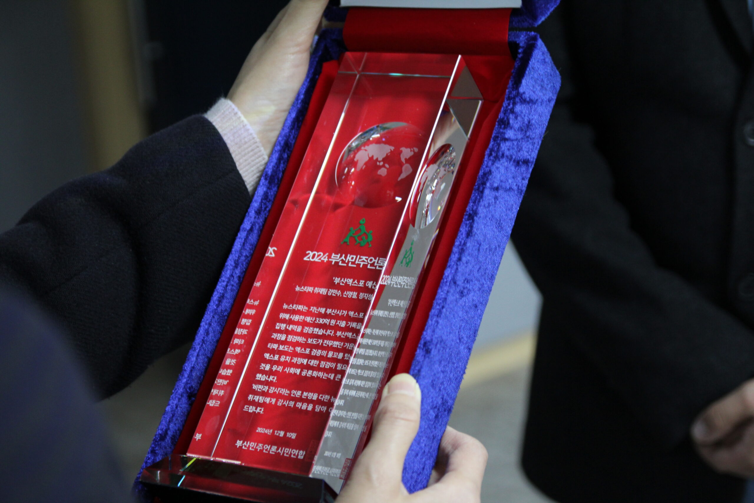지난 12월 10일 ‘2024 부산민주언론상’ 시상식이 부산시민운동지원센터에서 열렸습니다. 올해 부산민주언론상 수상작은 뉴스타파 <부산엑스포 예산 검증> 보도였는데요. 기사를 쓴 강민수 기자에게 직접 상패를 전달했습니다.