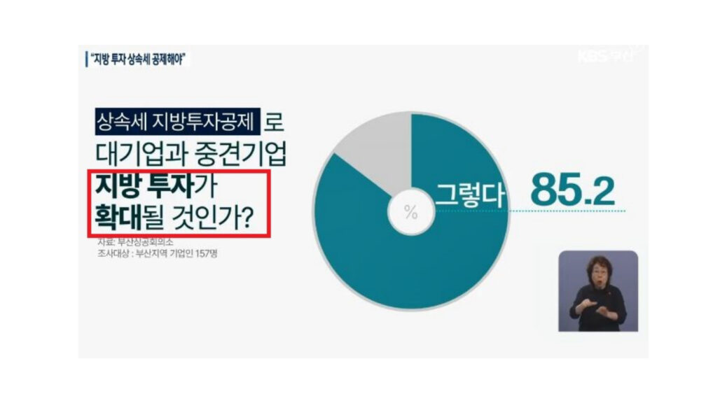 KBS부산은 최근 부산상공회의소가 ‘상속세 지방투자공제제도’ 도입을 정부ㆍ여당에 촉구할 것이라고 밝힌 내용을 전했다. 지방투자공제제도는 기업이 지방으로 본사를 이전하거나 신규 투자할 경우 투자액에 대해 상속세를 공제해주는 제도다. KBS부산은 해당 제도 도입으로 지방투자가 확대되고 가업 승계 활성화에서도 도움이 될 것이라는 지역 기업인들의 목소리를 알렸다.