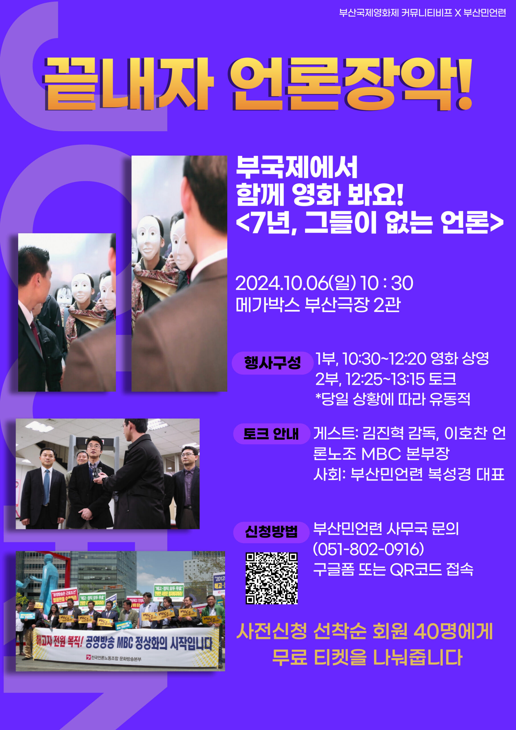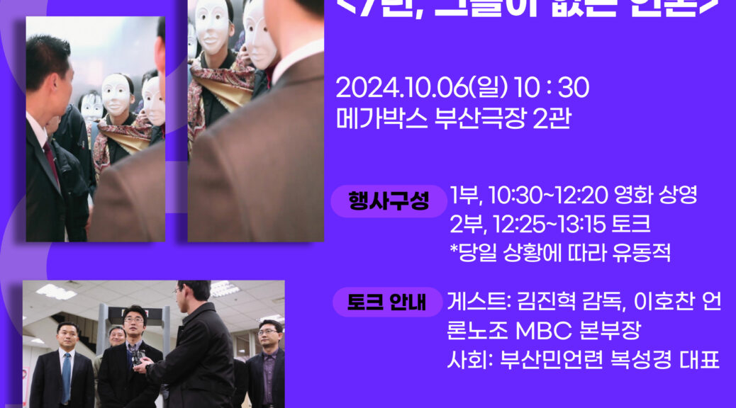 영화가 상영되고 난 뒤 영화를 연출한 김진혁 감독, 지금 언론장악 최전선에서 투쟁 중인 언론노조 MBC본부 이호찬 본부장을 모셔 부산민언련 복성경 대표 사회로 영화와 지금 현실에 대해 대화를 나눕니다.