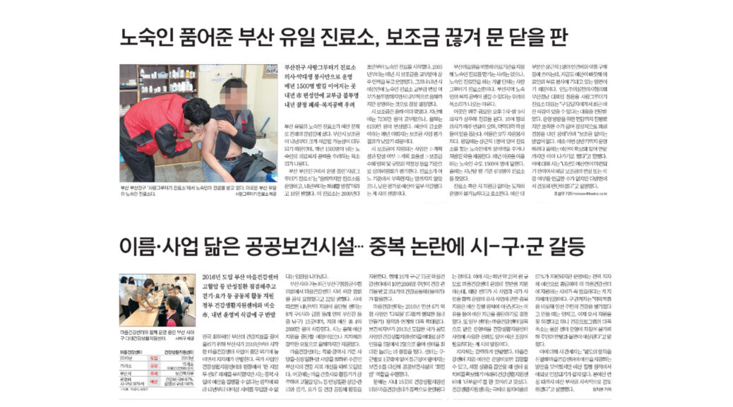 노숙인 진료소와 함께 공공보건시설에 대한 예산도 중단될 위험에 빠졌다. 국제신문의 <이름·사업 닮은 공공보건시설…중복 논란에 시-구·군 갈등>(6면, 7/24)을 따르면, 부산의 건강지표를 올리기 위해 부산시가 2016년부터 시작한 마을건강센터 사업이 중단 위기에 놓였다. 최근 부산시가 중복 사업에 예산을 집행할 수 없다며 시 지원을 중단했다. 정부 사업인 건강생활지원센터와 ‘한 지붕 두 센터’ 체제로 운영하면서 중복 지원 문제가 불거진 것이다. 그러나 관련 지자체는 마을건강센터 지원 예산만으로 운영할 수 없어 건강생활지원센터에 ‘더부살이’한 것이라고 호소한다. 예산 부족으로 인한 어쩔 수 없는 ‘고육지책’이라는 말이다.