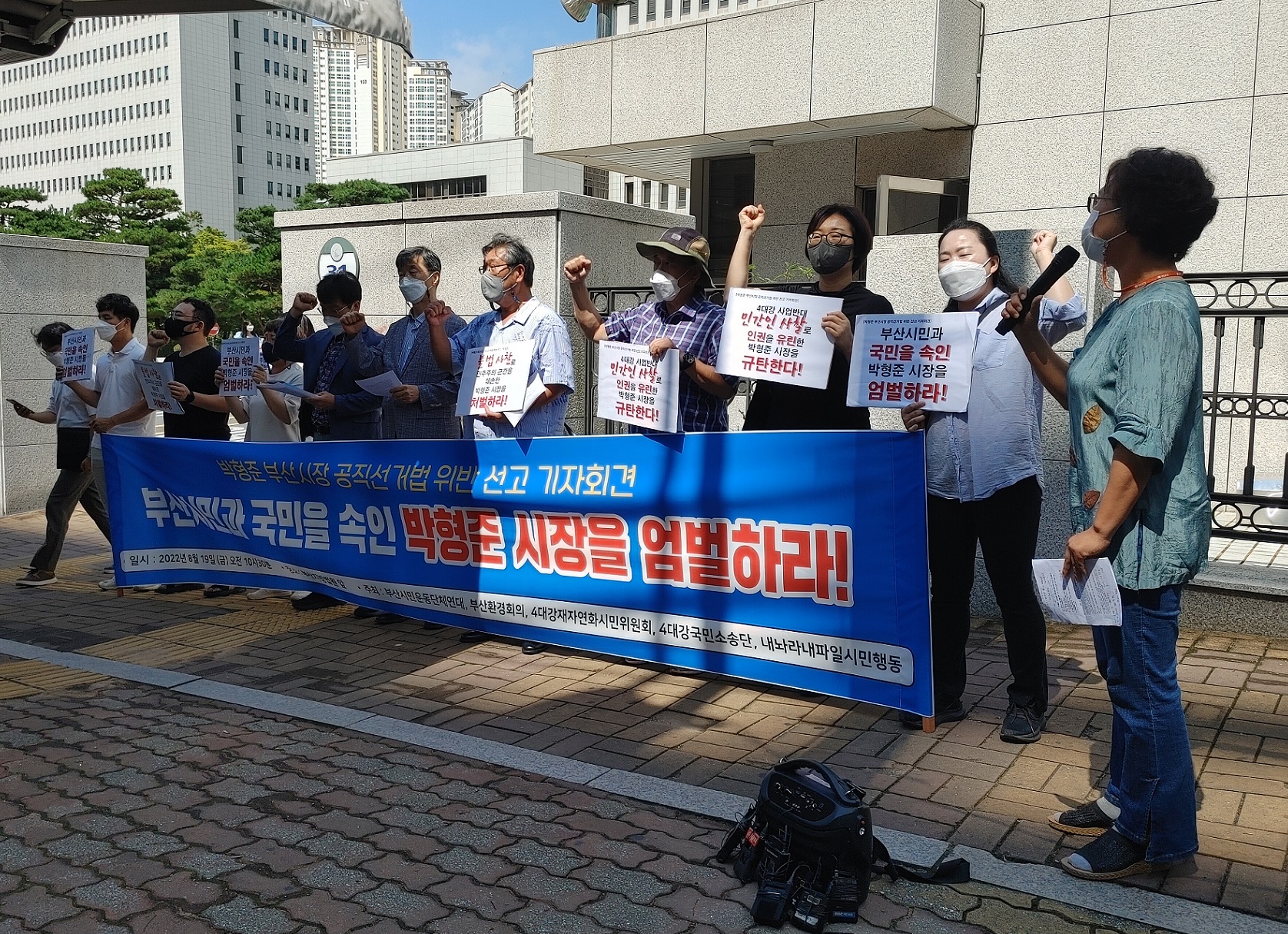 8월 19일 부산지방법원이 박형준 부산시장의 공직선거법 위반(허위사실공표)에 대해 무죄 선고를 내린 것과 관련해, 부산시민운동단체연대,부산환경회의,4대강국민소송단 등 시민단체는 부산지방법원 앞에서 기자회견을 열고 재판부의 결정을 비판했습니다.