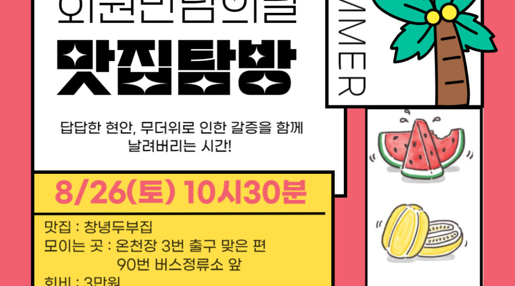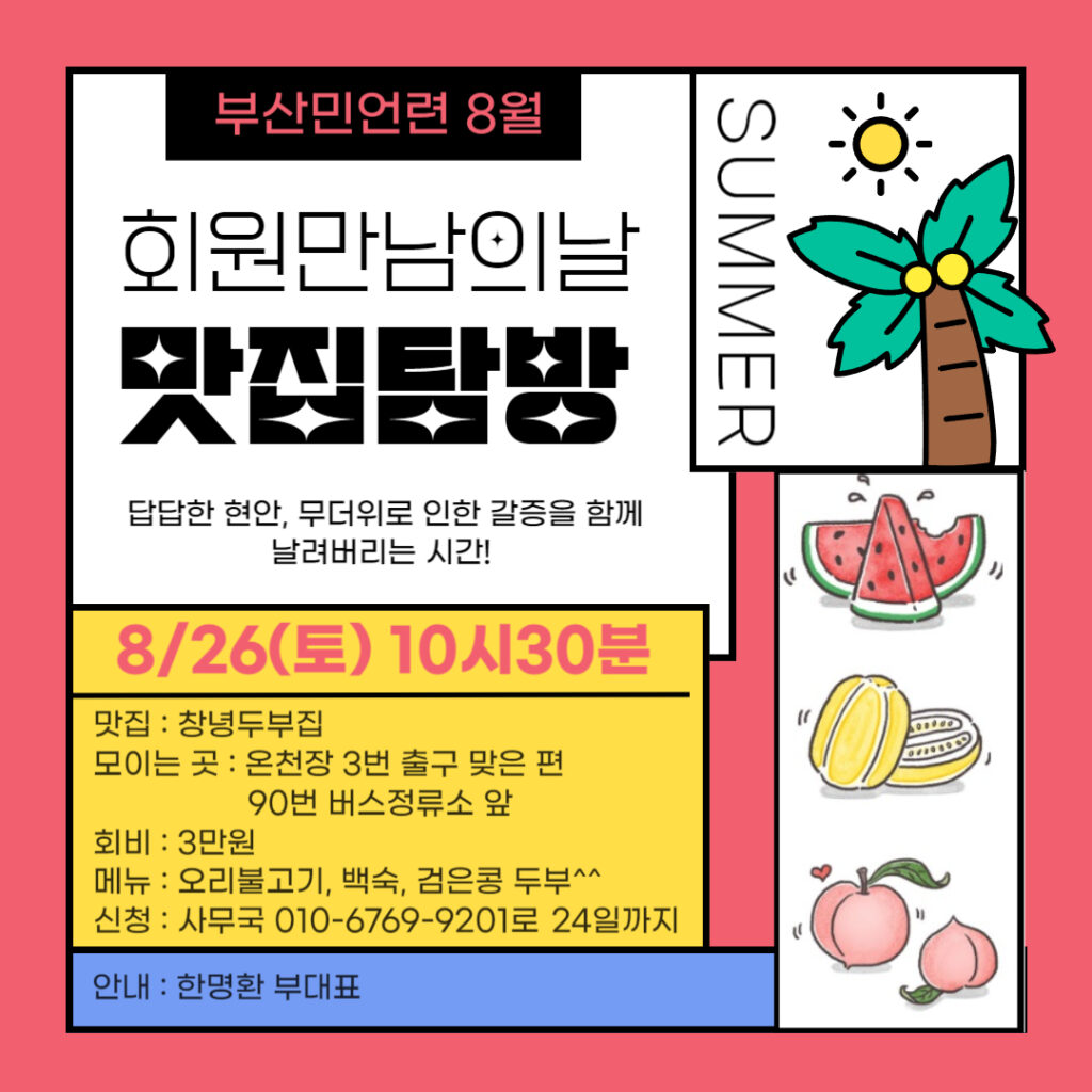 부산민언련 8월 회원만남의 날은 ‘맛집 탐방’으로 진행합니다.