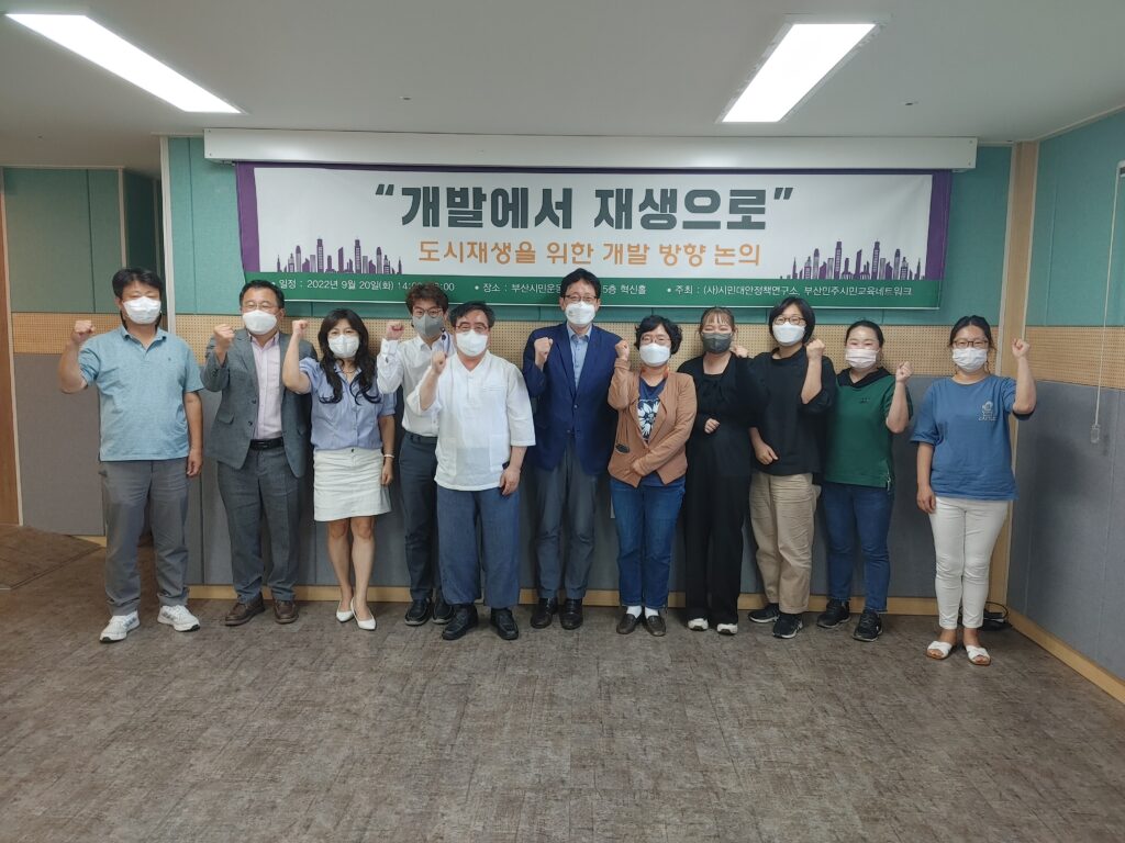 부산시민운동단체연대는 9월 20일 ‘도시재생을 위한 개발방향 논의’를 주제로 활동가 교육을 진행했습니다. 먼저 정주철 부산대 도시공학과 교수의 발표로 부산시의 공공기여제 현황과 쟁점을 공유했습니다. 한진CY부지, 한국유리 옛 공장 터, 다대포 한진중공업 부지 등 부산 곳곳에서 진행되고 있는 공공기여협상제가 유휴부지의 거점개발, 공공성 확보라는 도입 취지와 달리 대규모 아파트 단지 건설이라는 난개발‧특혜성 개발로 변질되고 있음을 알 수 있었습니다. 산업의 발전과 건강한 일자리 창출을 위해서 꼭 필요한 공업지역,상업지역이 축소되는 결과만 낳고 있었습니다.