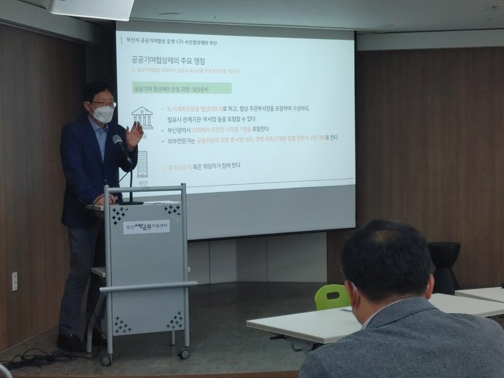 발표 후에는 현행 공공기여제, 부산시의 개발 정책을 개선하기 위한 방안을 논의했습니다.