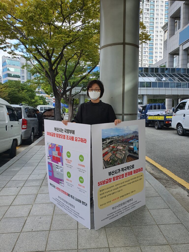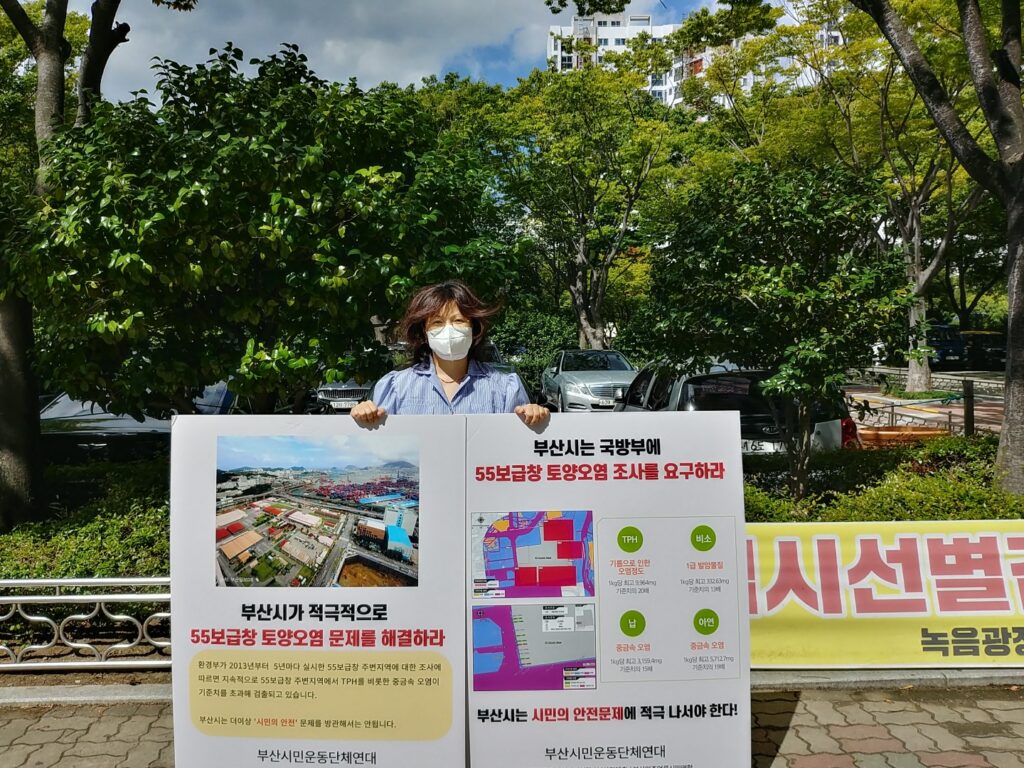 이에 부산시민운동단체연대는 9월 14일 부산시의 적극적인 대처를 촉구했습니다. 국방부에 미55보급창 토양 오염 조사를 요구하는 등 시민안전 문제에 나설 것을 촉구하는 기자회견을 시작으로 9월 19일부터 한달간 매일 시청 앞에서 ‘55보급창 토양오염 조사 촉구 1인시위’를 진행하고 있습니다. 부산민언련은 20일 박정희, 김보영 활동가가 1인시위에 참여했습니다. 시민연대는 1인시위 외에도 부산시 관계자 면담 등을 추진하고 계속 공론화해나갈 계획입니다.