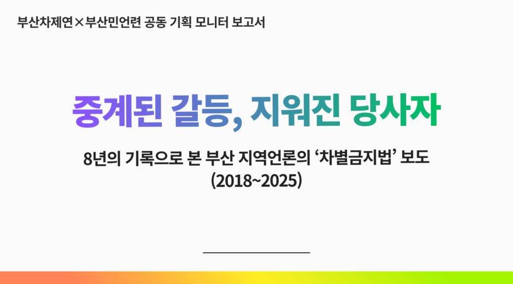 하지만 이를 전달하는 지역언론의 시선은 이러한 전국언론의 한계를 답습하며, 인권의 본질보다 무관심과 갈등의 프레임에 매몰되어 있다는 지적이 끊이지 않고 있다. 이에 부산민주언론시민연합(이하 ‘부산민언련’)과 부산차제연은 지역언론이 인권 의제를 공론화하는 과정에서 시민의 올바른 이해를 돕는 사회적 책임을 다하고 있는지 점검하기 위해 ‘차별금지법’ 관련 보도 모니터링을 진행했다. 혐오 표현을 무비판적으로 옮기거나 특정 주장에 치우친 보도가 지역 공론장에 어떤 부정적 영향을 주는지 점검하고, 이를 통해 우리 지역언론이 나아가야 할 바람직한 보도 방향을 제안하고자 한다.