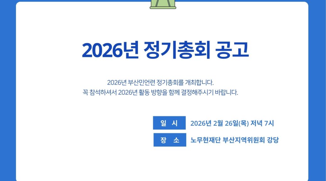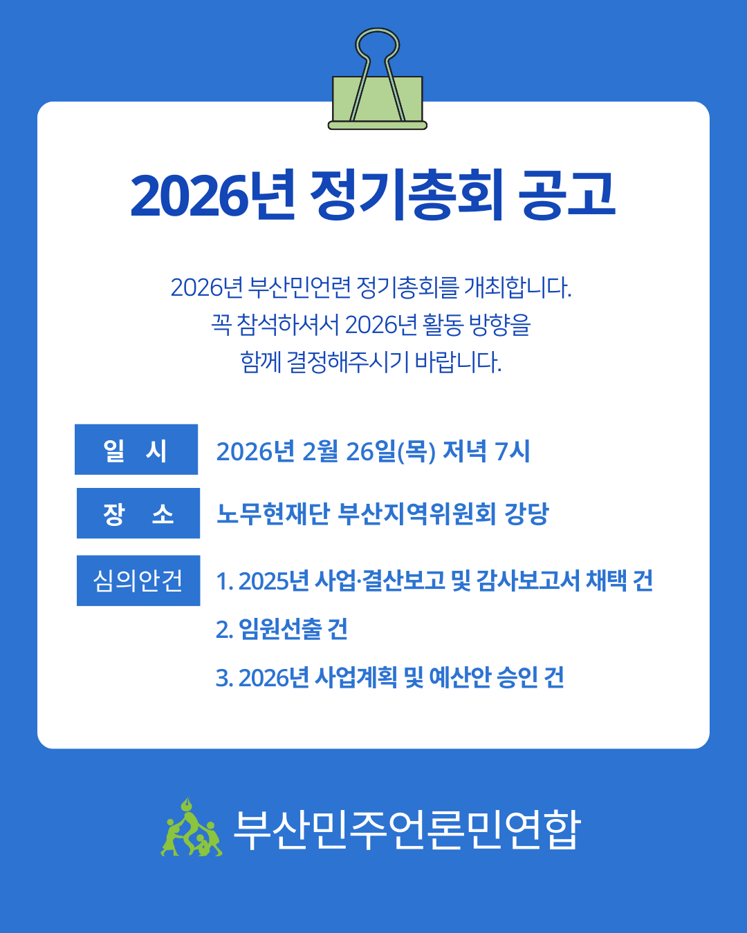 부산민언련은 2026년 정기총회를 앞두고 시민을 위한 언론 · 미디어 환경을 만들어가기 위한 사업 방향을 논의하고 있습니다. 특히 회원의 뜻을 모아 활동 방향을 수립하고자 합니다.