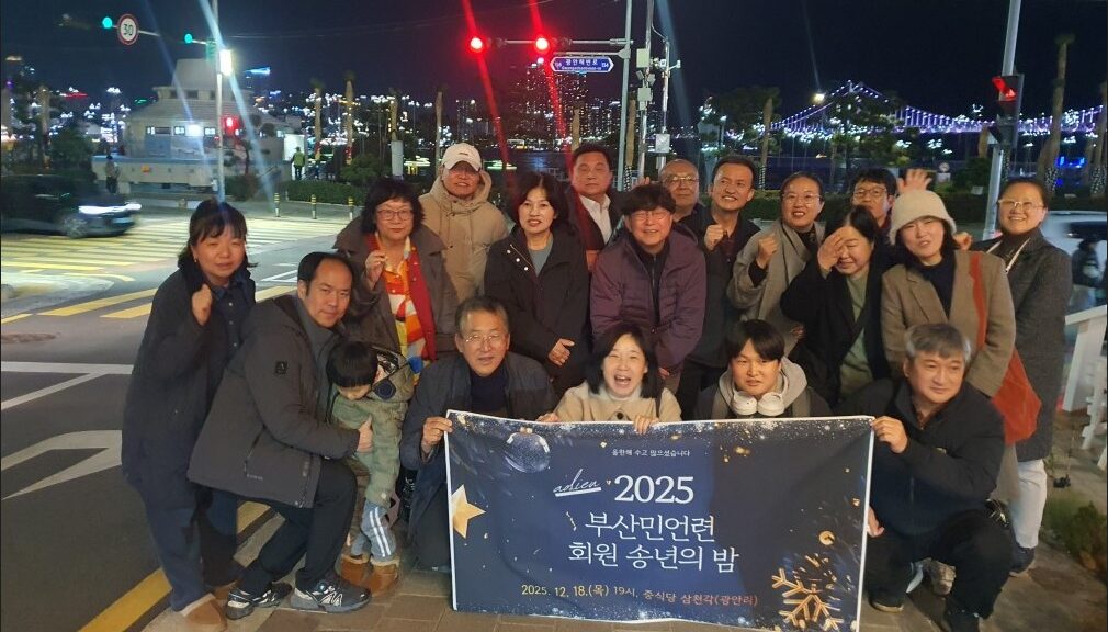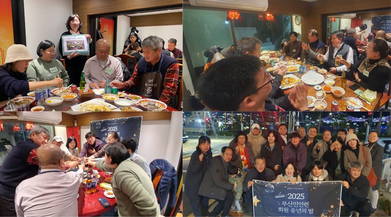 계엄과 탄핵, 숨 가빴던 정국 속에서도 이처럼 각자의 자리에서 부산민언련을 지켜온 회원들이 있었기에 송년회가 더욱 단단하고 따뜻하게 느껴졌습니다. 많은 말보다 “올해도 함께해서 든든했다”는 마음이 자연스럽게 오간 밤. 함께해주신 모든 회원 여러분, 고맙습니다. 내년에도 서로의 곁에서 다시 만나길 기대합니다.