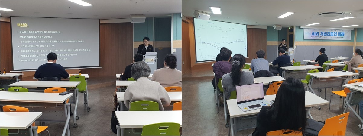 AI가 만들어내는 컨텐츠가 폭증하는 시대, 미디어 환경은 어떻게 변화하고 저널리즘은 어떤 역할을 해야 하는지 함께 고민해보는 자리였는데요. 슬로우뉴스 이정환 대표가 ‘AI가 불러온 공론장의 위기, 저널리즘은 새로운 공론장을 열어야한다’는 주제로 강의했습니다.