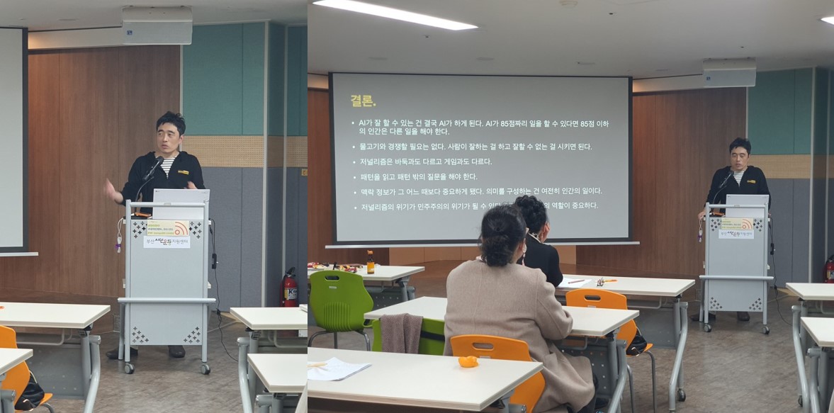 올해 마지막 강좌는 AI가 공론장의 위기, 민주주의 위기를 초래하는 시애에 언론은 어떤 역할을 해야하는지에 진지하게 고민하고 공감하는 시간이었습니다. 먼길 달려와 문제의식을 함께 나눠주신 이정환 슬로우뉴스 대표님과 강연에 함께 해주신 시민, 회원님들 모두 고맙습니다.